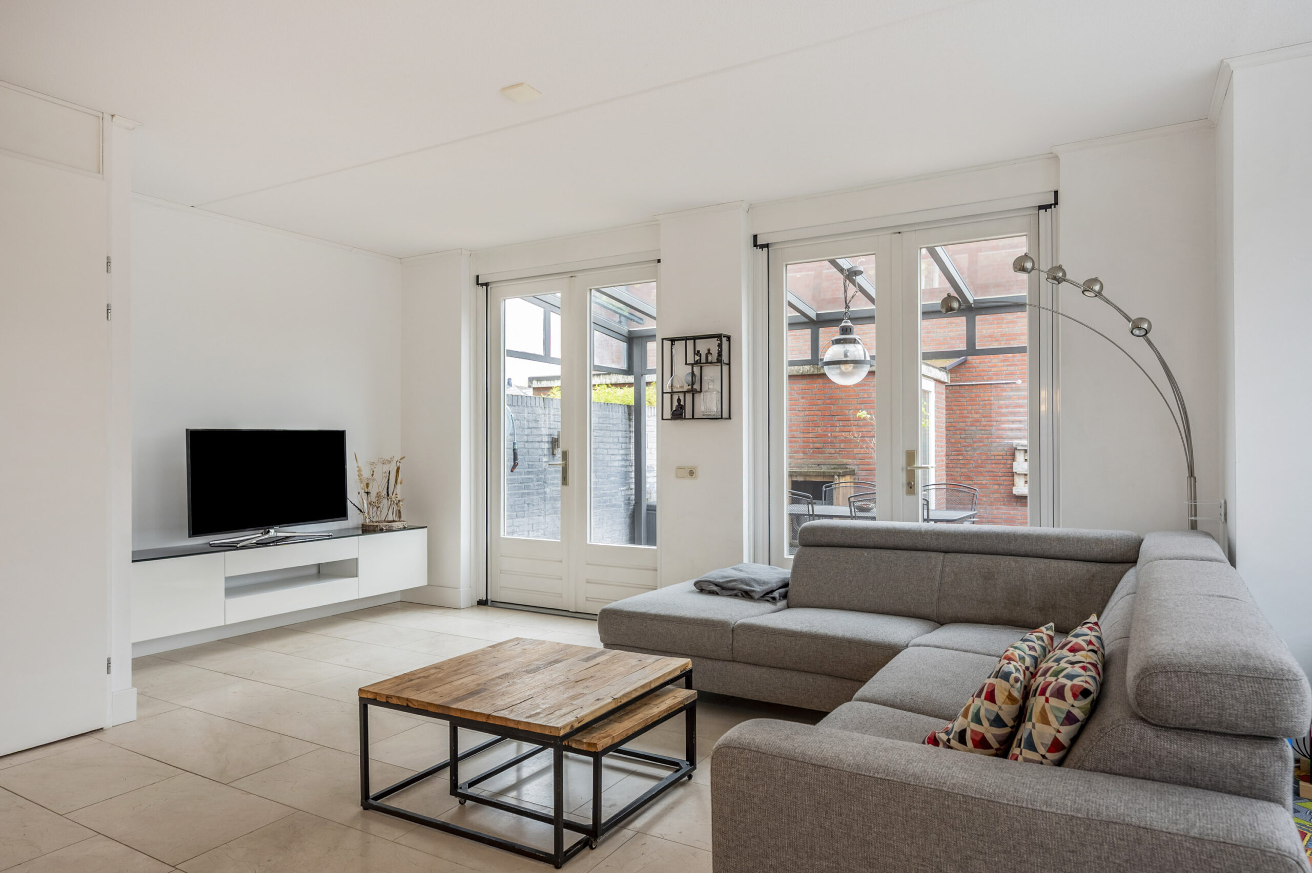 Onder de trap in de woonkamer is er tevens een berging/provisiekast. Via twee openslaande deuren is toegang tot de tuin.