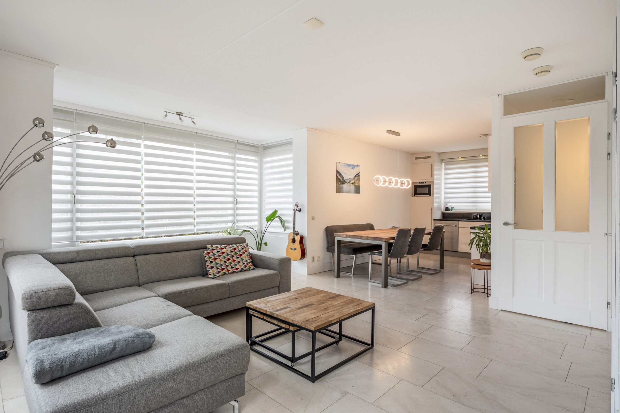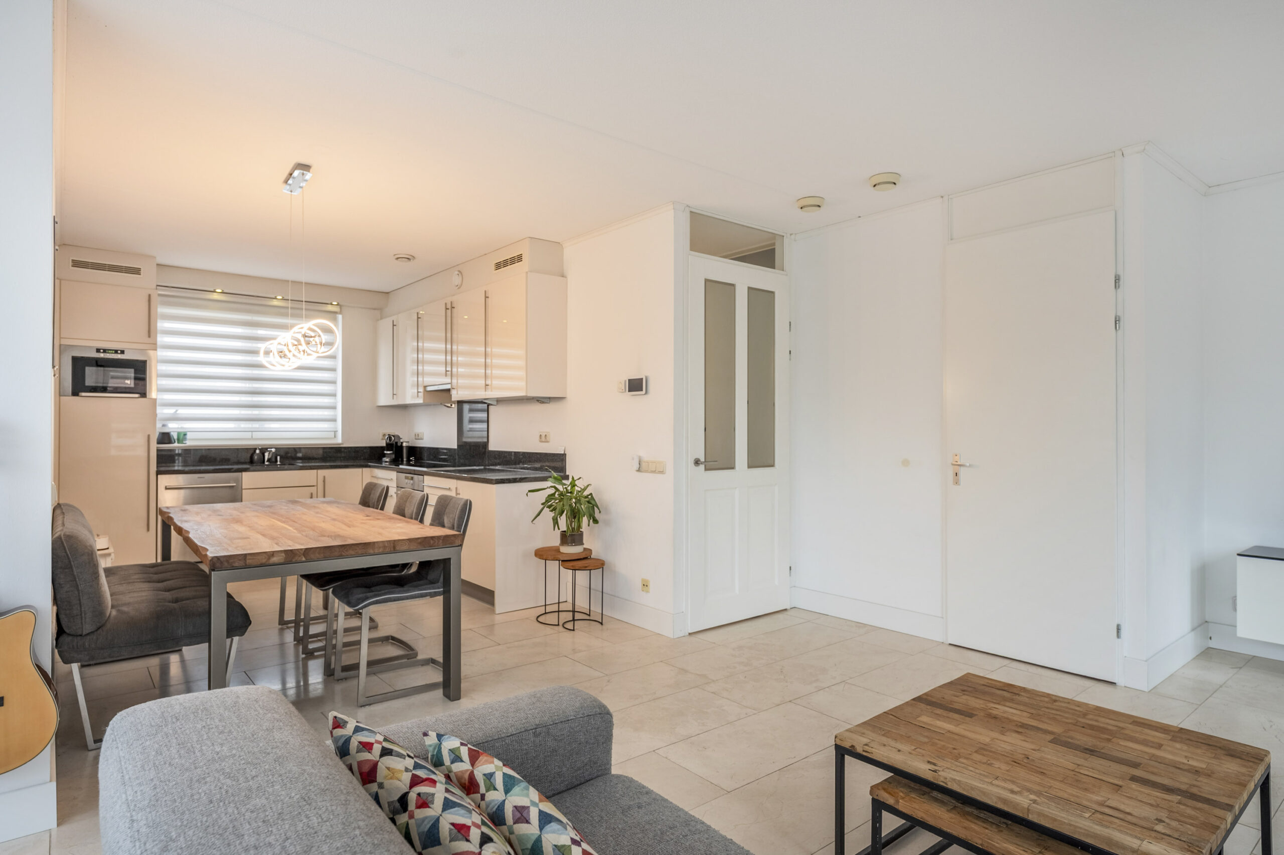 De woonkamer met open keuken (ca.38 m²) valt op door de praktische indeling. U kunt op diverse wijze uw interieur inrichten. De gestucte woonkamer is door de vele raampartijen zeer licht en zonnig. De vloer is voorzien van een prachtige natuurstenenvloer welke is voorzien van vloerverwarming!