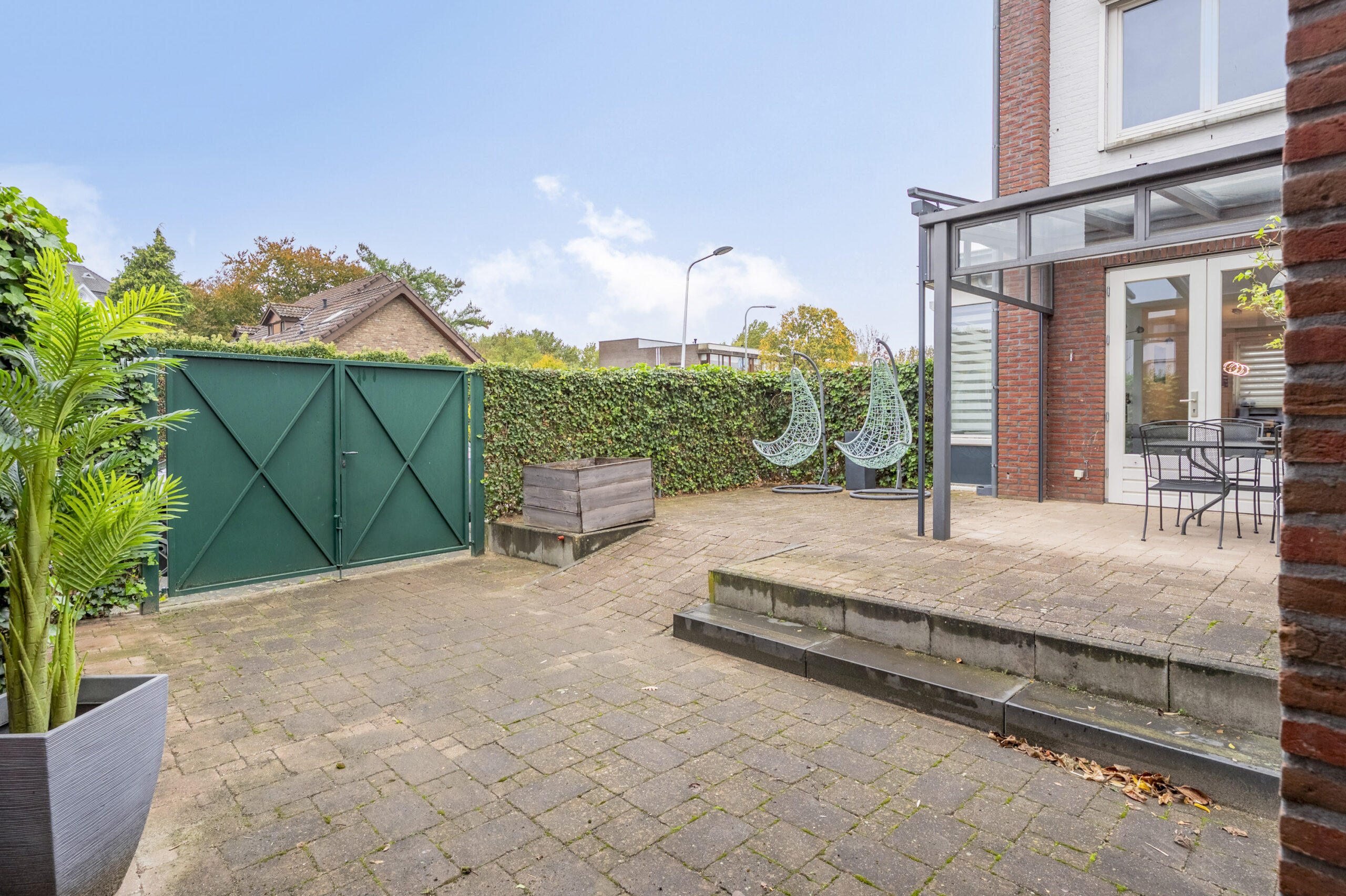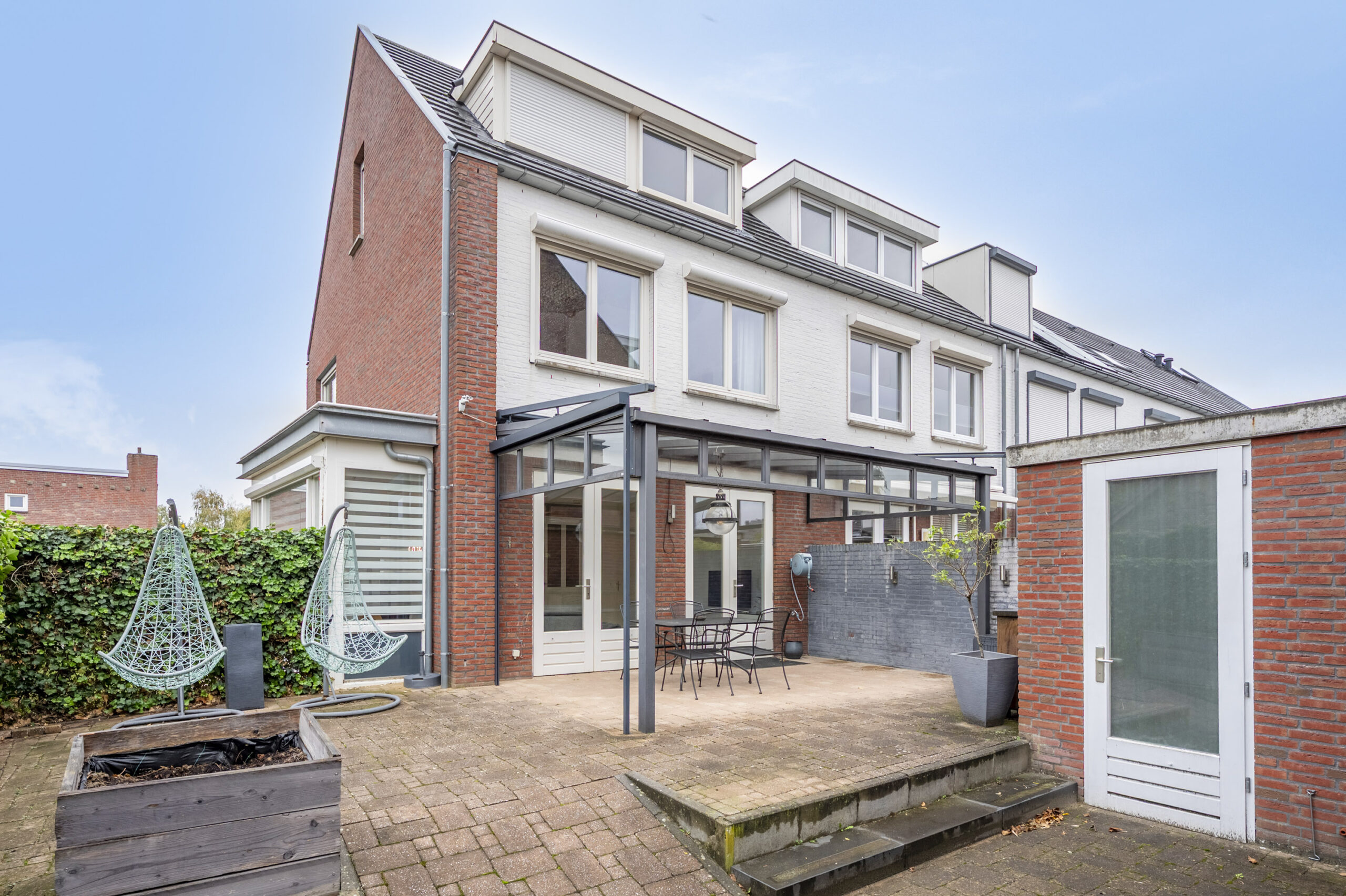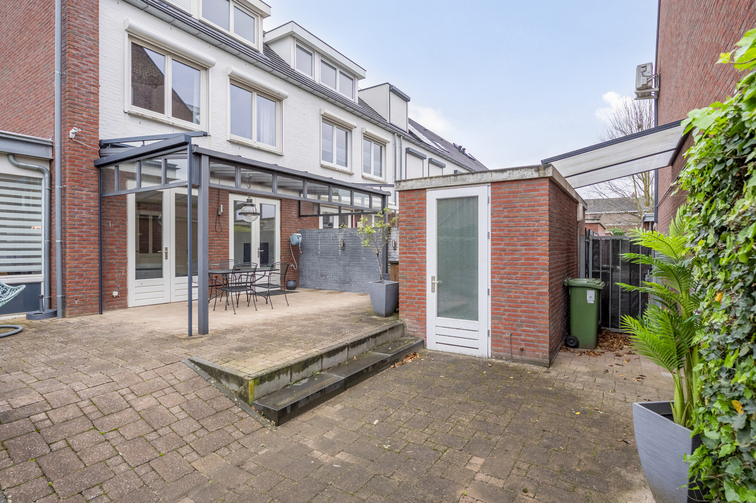 Mooi aangelegde tuin op het zuiden gelegen en voorzien van overkapping, sierbestrating, achterom en stenen berging. Privé parking aan de achterzijde van de woning.