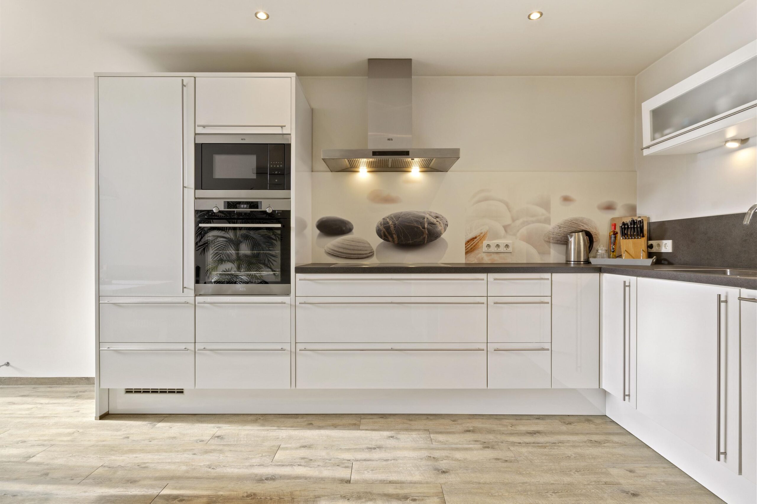 De luxe keuken is bereikbaar via een glazen deur vanuit de woonkamer en beschikt over een inductiekookplaat, combimagnetron, heteluchtoven, vaatwasser, koelkast en afzuigkap.