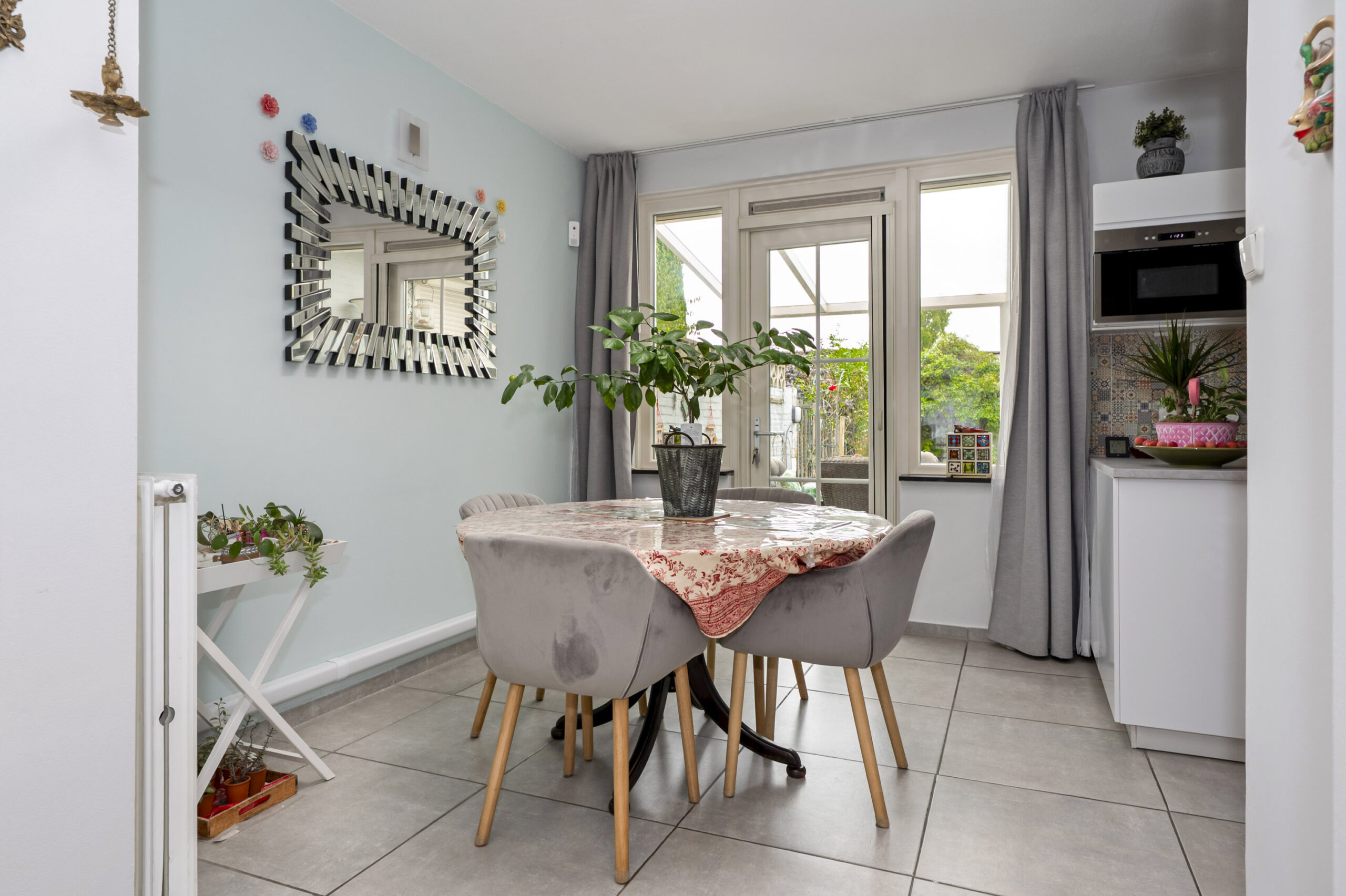 Grote ramen, de aansluiting voor een kachel en het hoge plafond met sierlijsten en ornamenten bepalen de sfeer in de royale woonkamer. De hele woonkamer kan als zitkamer worden ingedeeld, waardoor er plek is voor een zit- en een tv-hoek. Bij de zithoek hangt een airco-unit, die het hele jaar voor een aangename warmte zorgt.