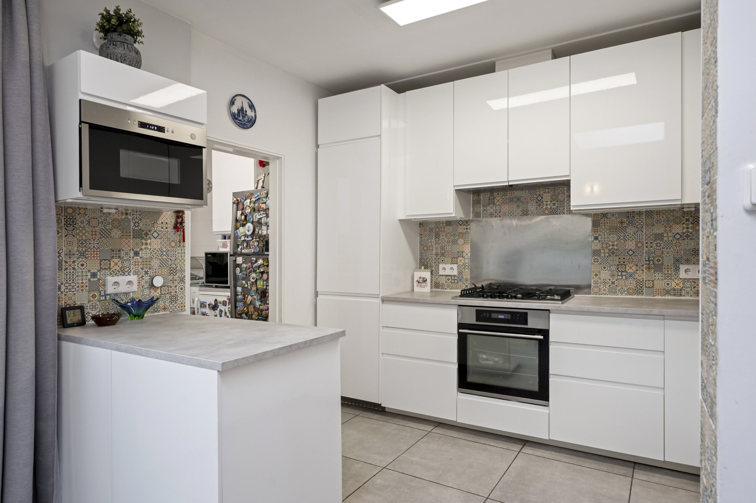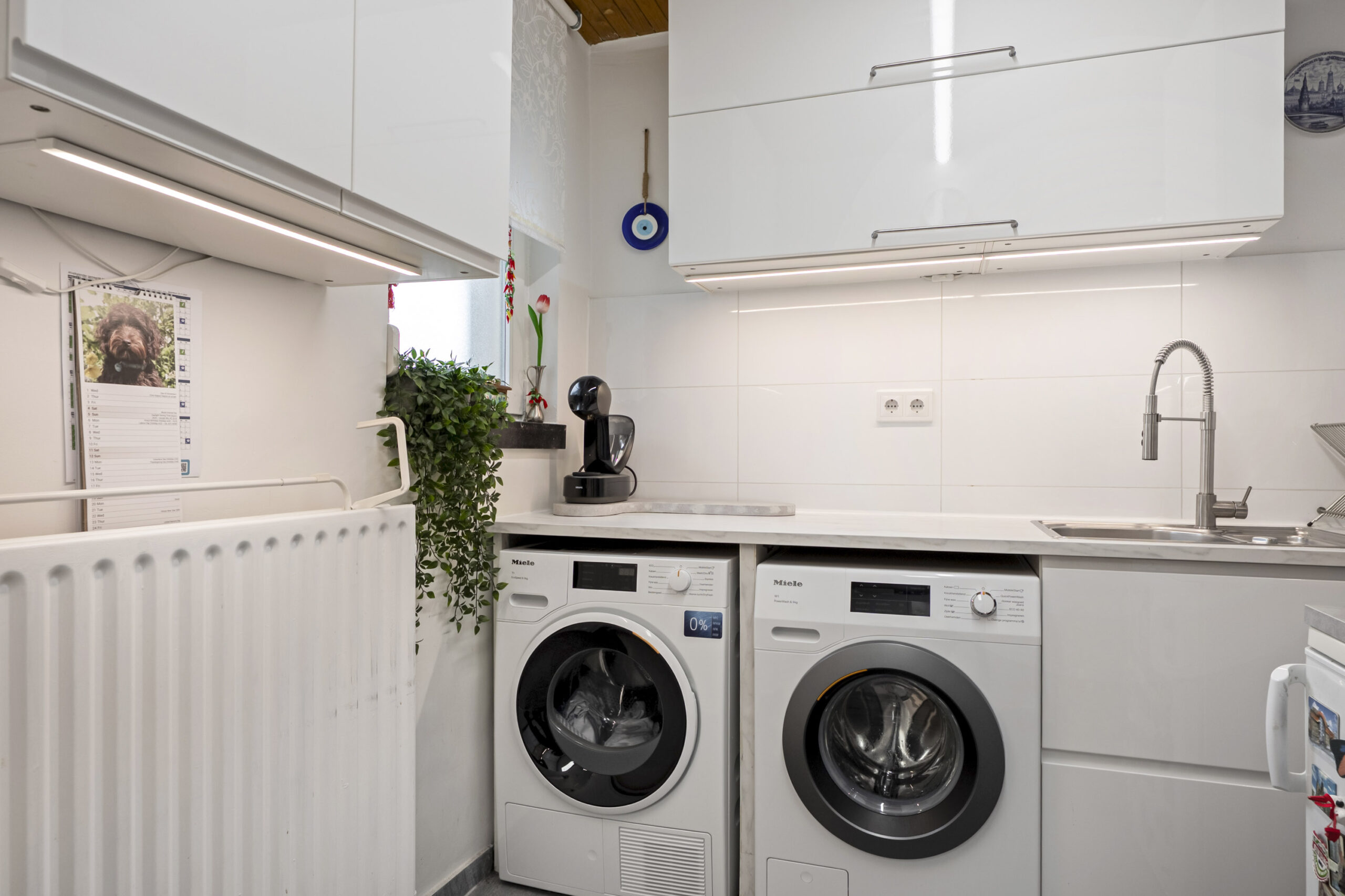 De bijkeuken is een verlengstuk van de keuken, met extra kasten en een spoelbak. Onder het aanrechtblad is ruimte voor de wasapparatuur en er is genoeg plek om bijvoorbeeld een vriezer neer te zetten.