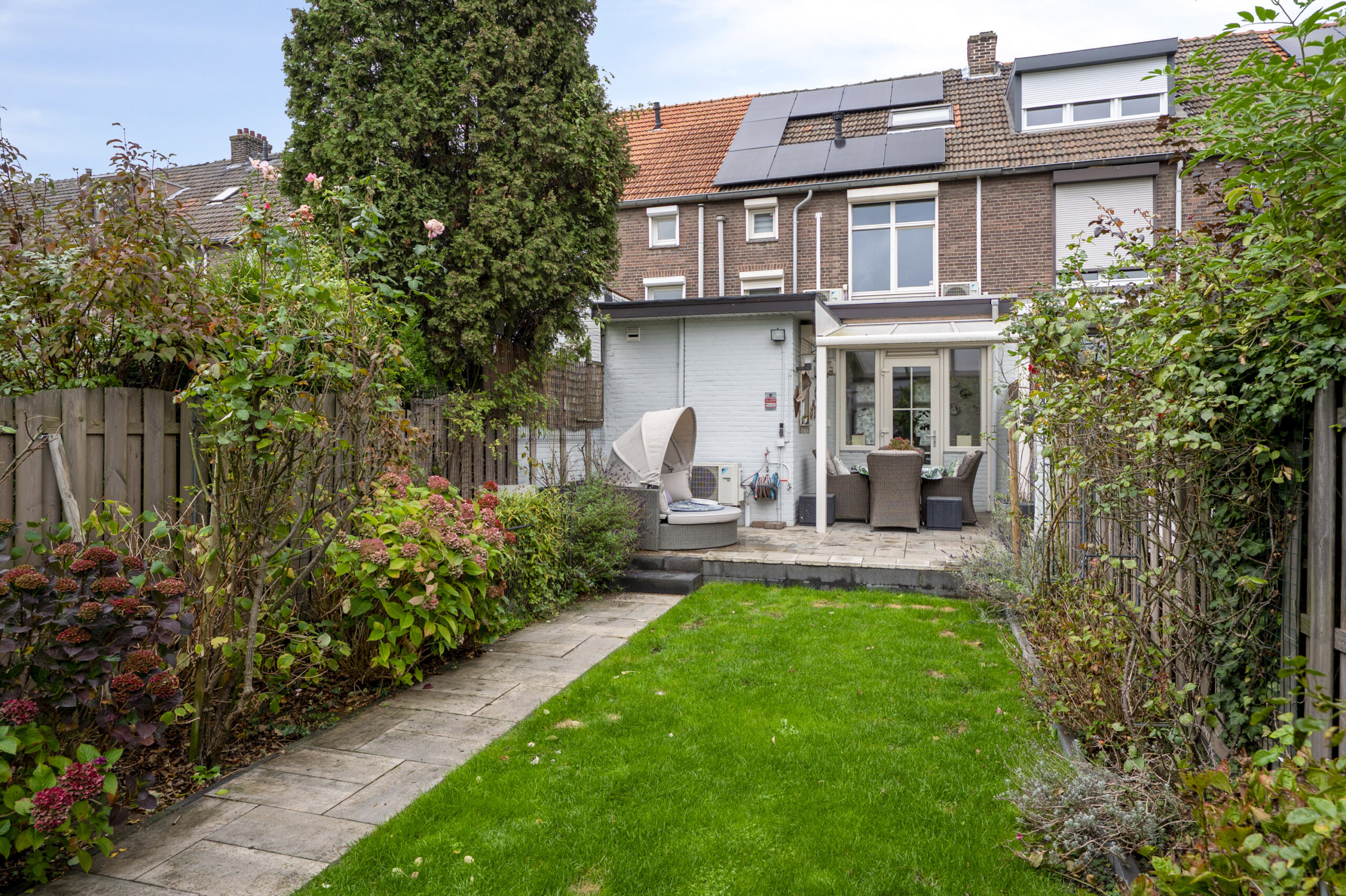 - Fraai aangelegde tuin met een overkapping, terras en achterom;