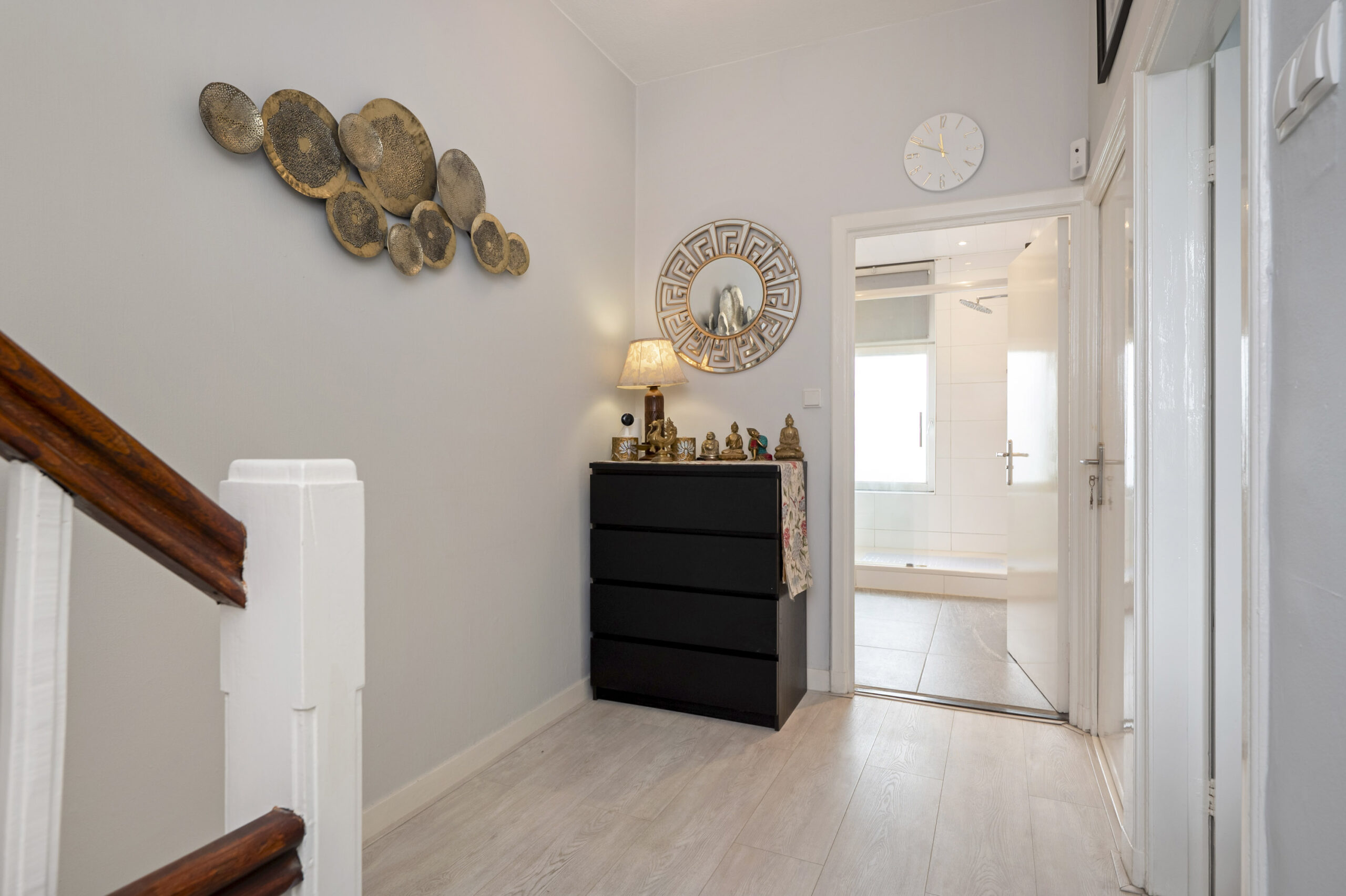 Via de bordestrap, met een groot raam in de achtergevel, loopt u van de begane grond naar de eerste verdieping. De overloop biedt toegang tot twee royale slaapkamers en de badkamer.
