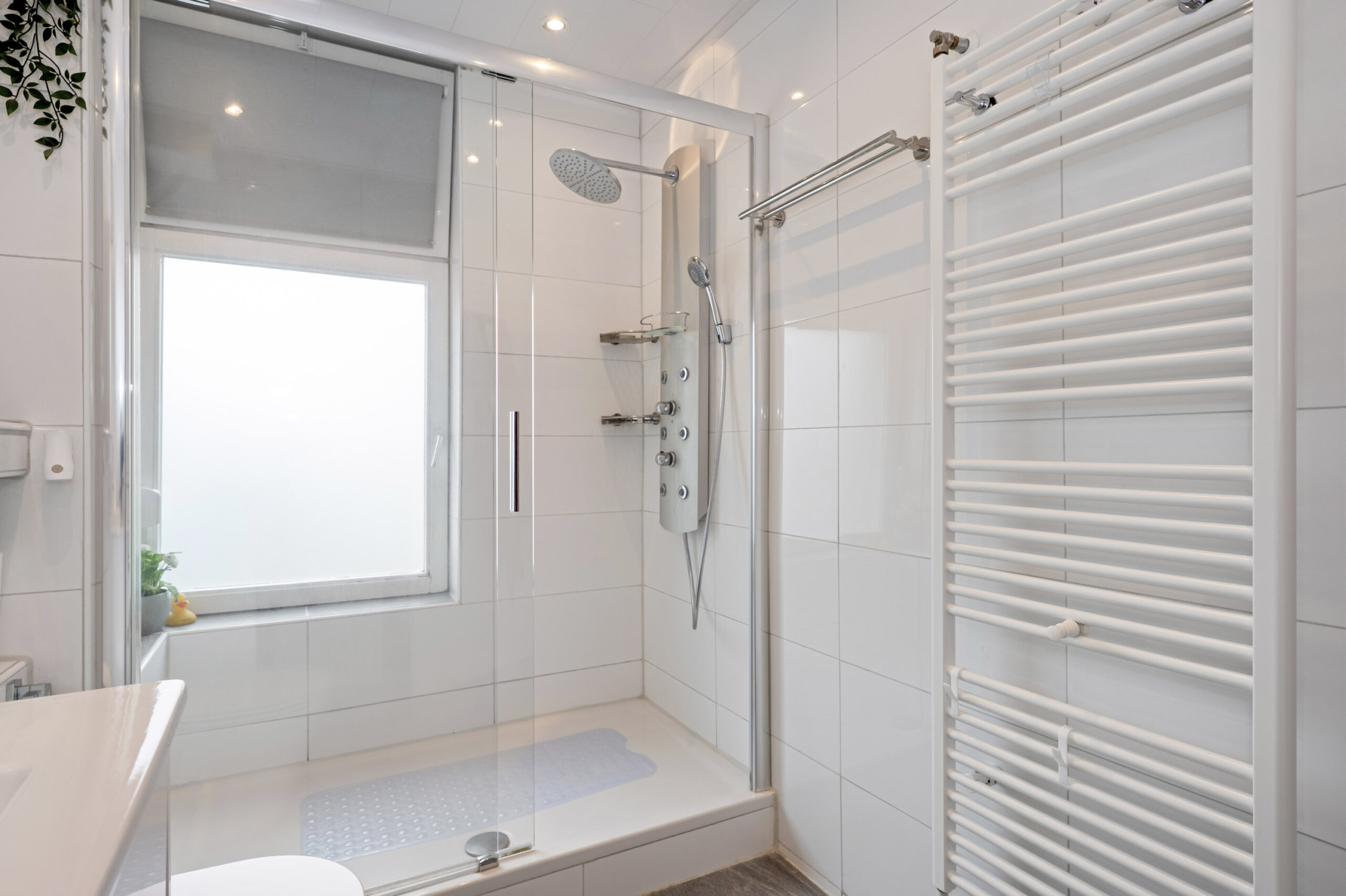 De ruime en lichte badkamer biedt alles wat je nodig hebt: een ruime douche met wandstralen, een tweede toilet en een wastafelmeubel met spiegelkast. Grote, witte wandtegels en grijze vloertegels bepalen de sfeer in deze mooie ruimte.