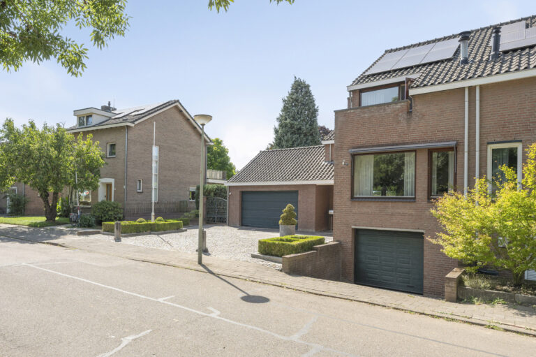 Mooi vormgegeven buxushagen, sierbestrating en een vlaggenmast bepalen de sfeer in de voortuin. Er is parkeergelegenheid voor meerdere auto’s, en naast de garage is een eigen achterom met een fraaie poort.