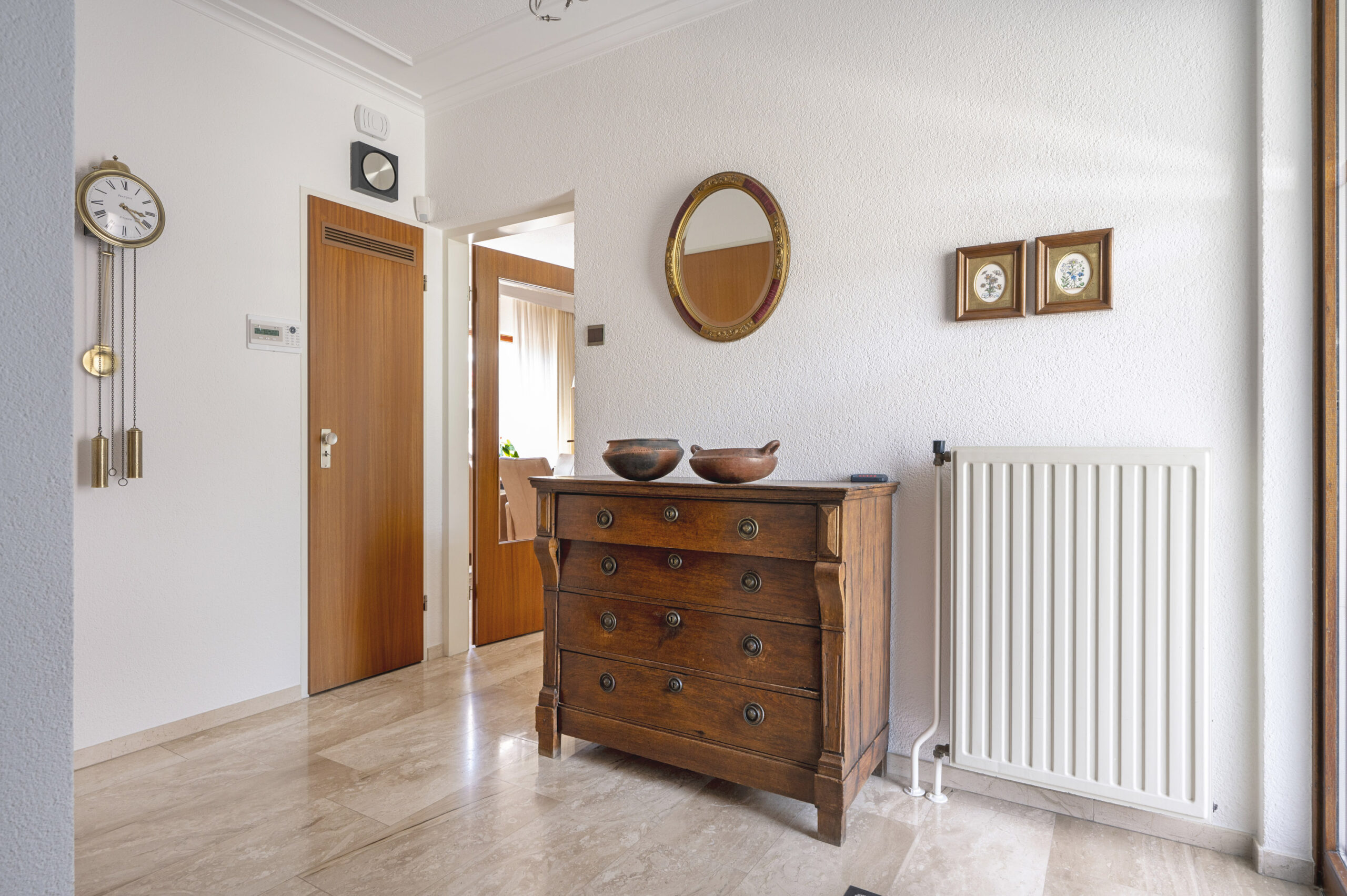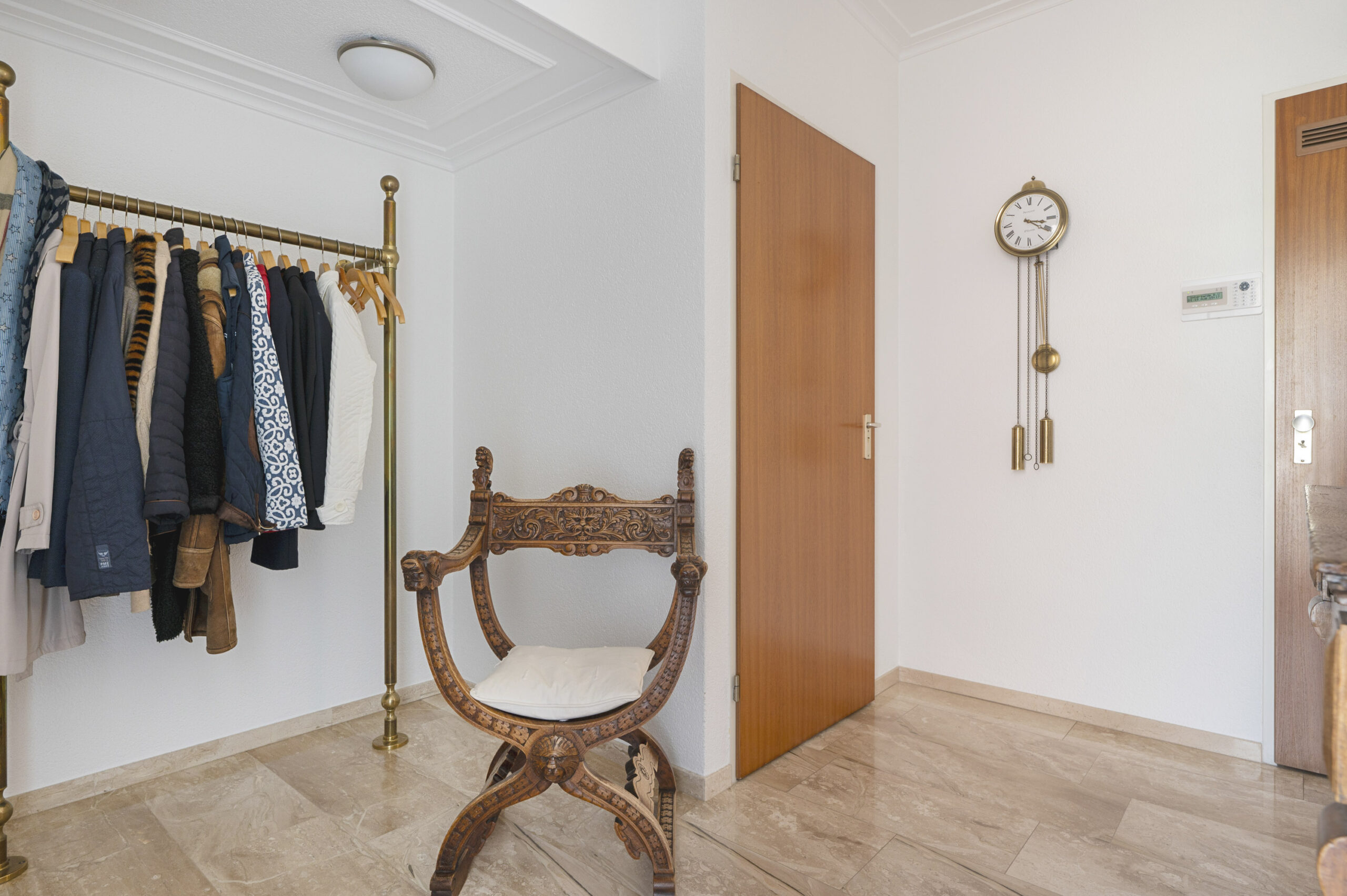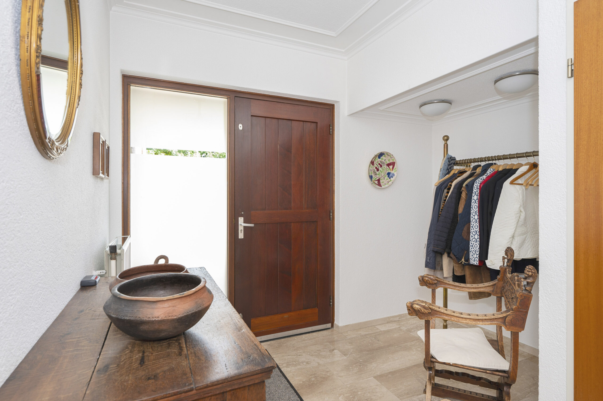 Vanaf de oprit loop je naar de overdekte entree, rechts van de garage. De hal is een stijlvolle ontvangstruimte, met een travertinvloer en de garderobe. Aan de linkerzijde is het gastentoilet met een wandcloset, fonteintje en een grote spiegel.