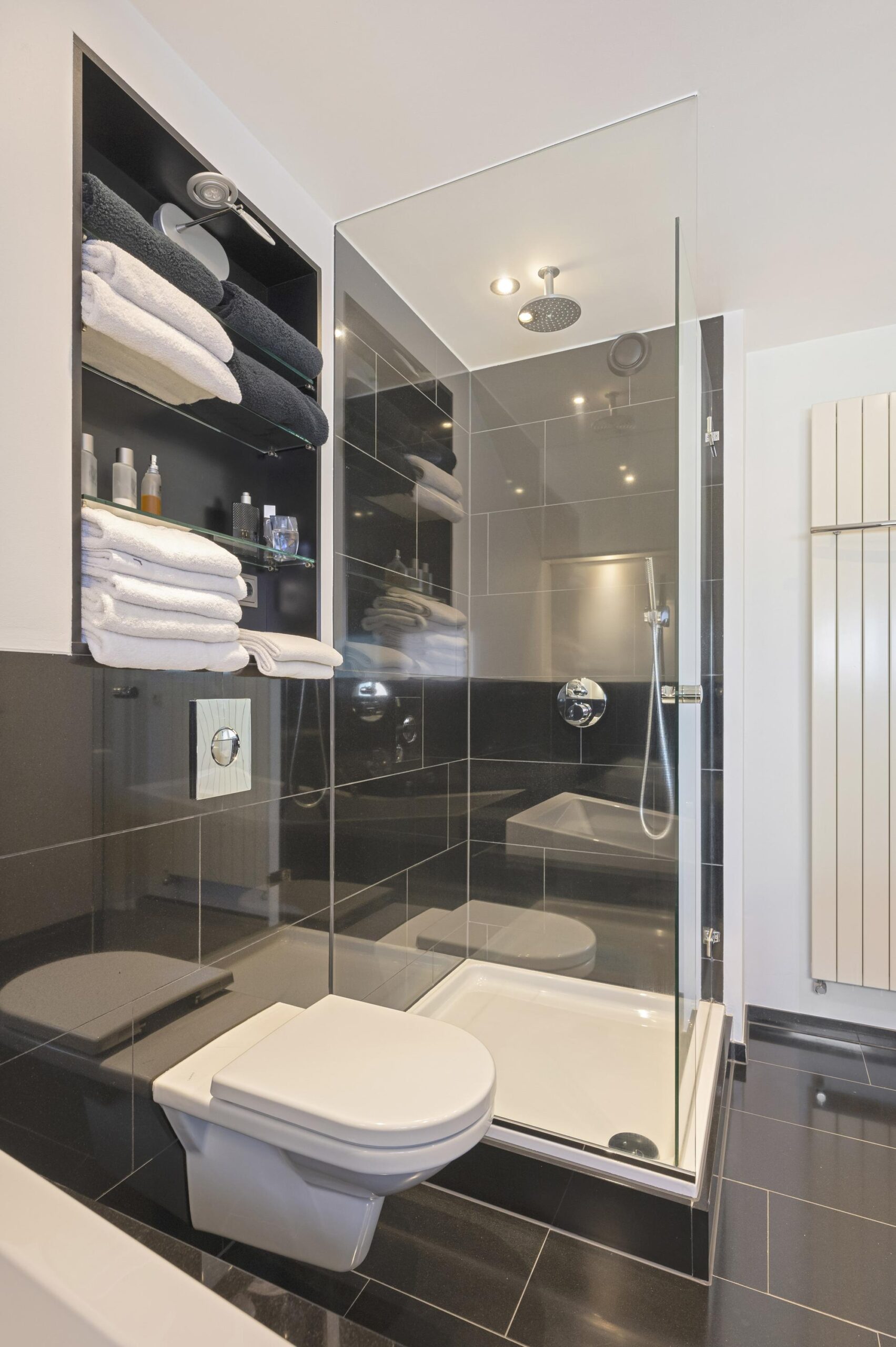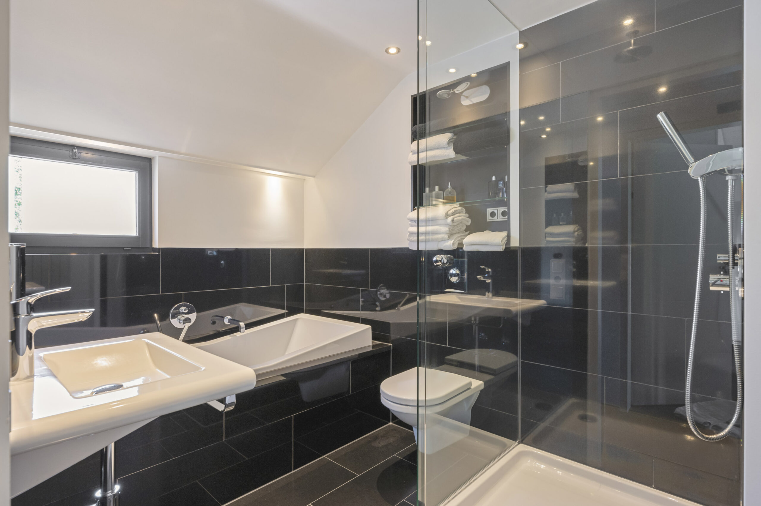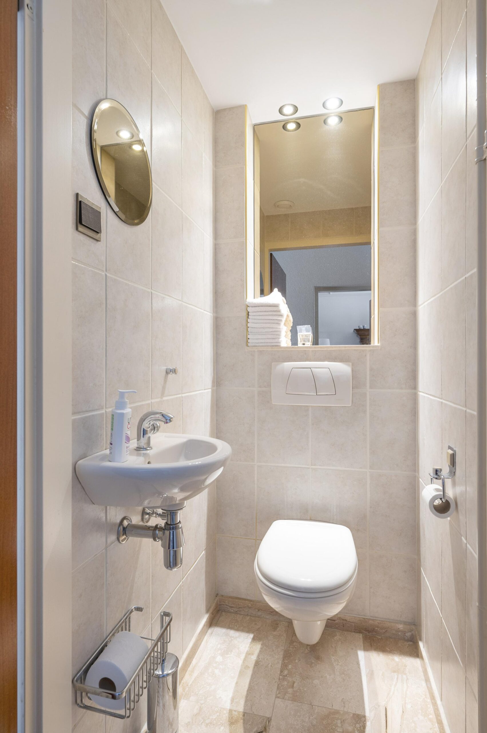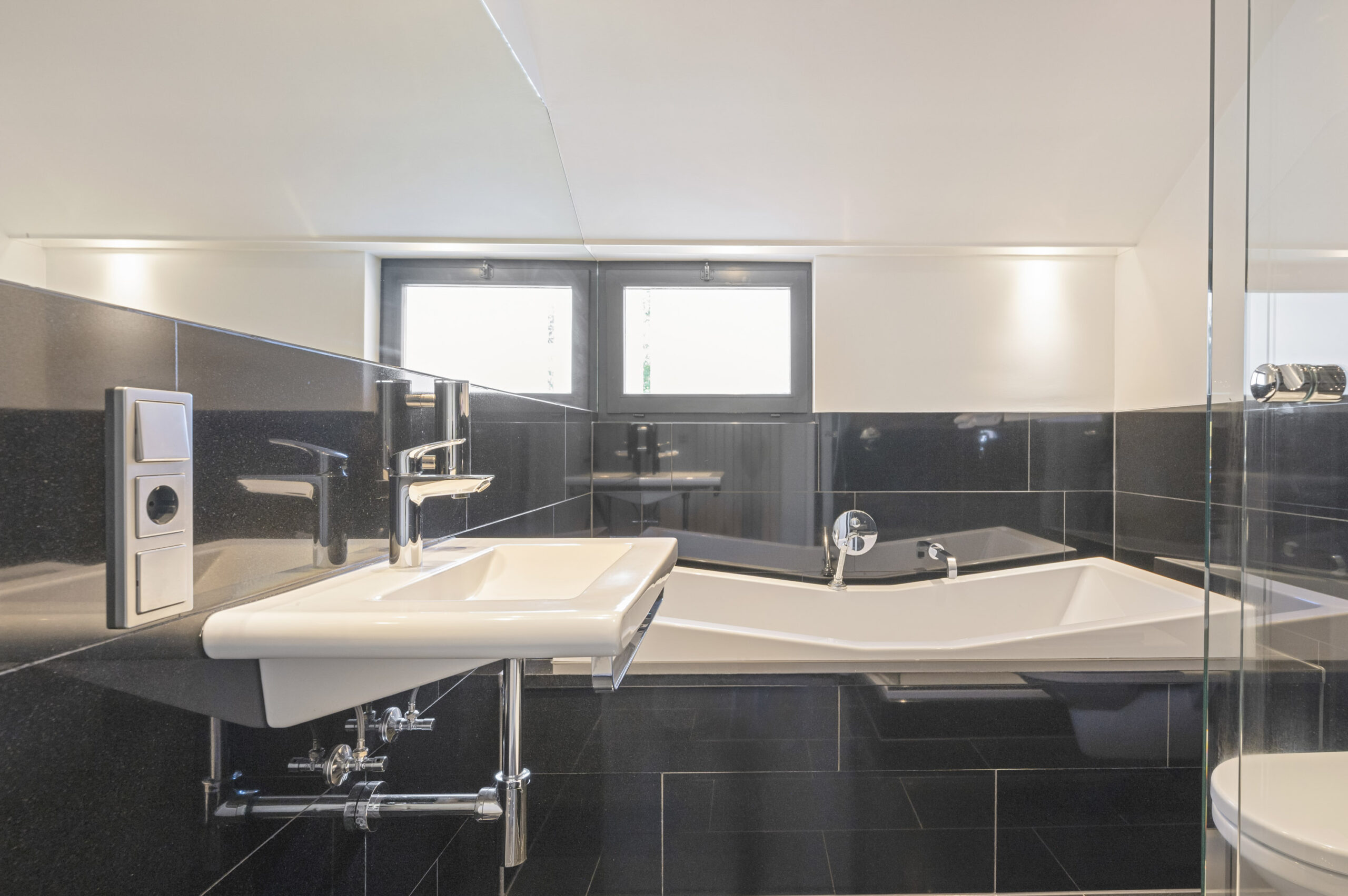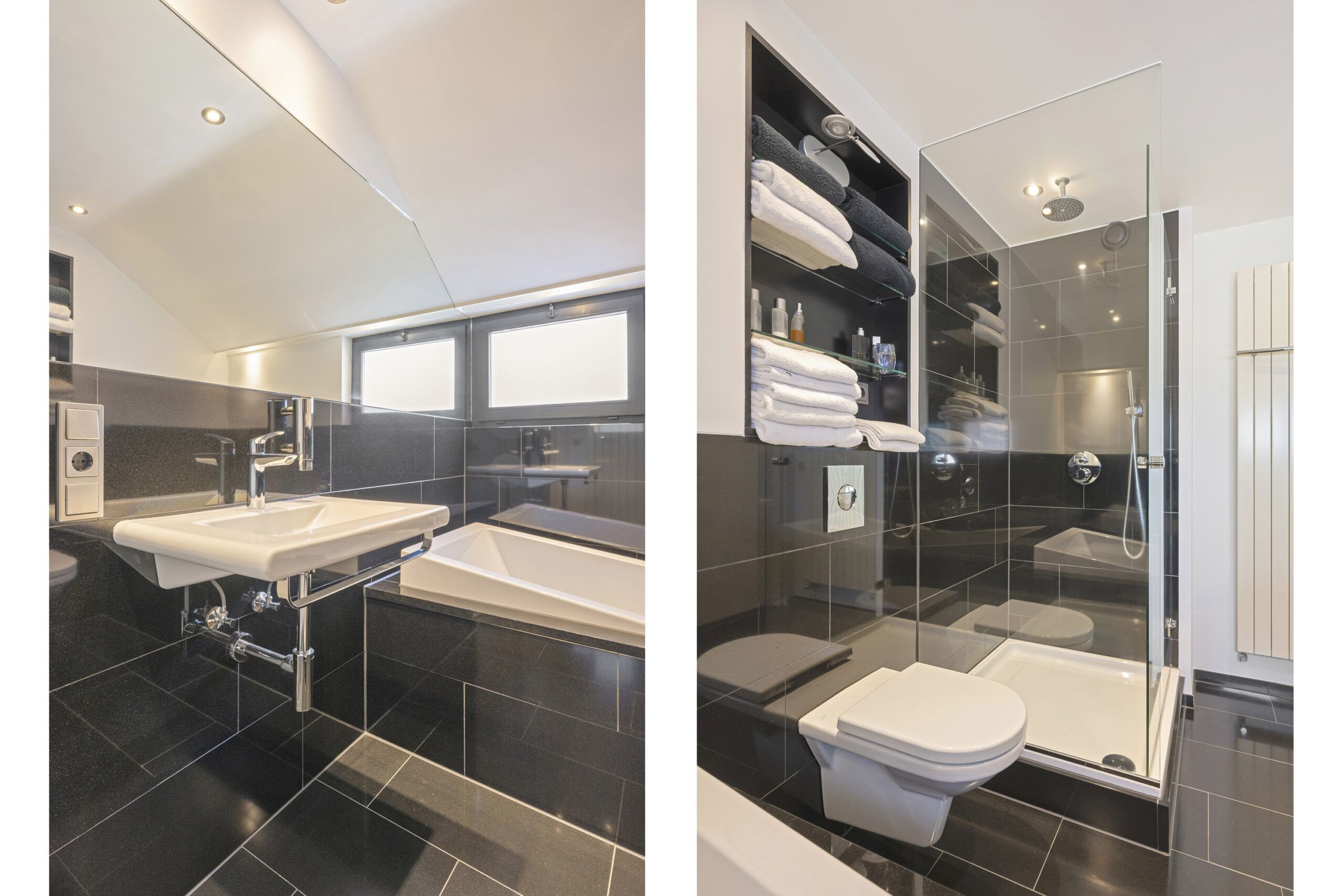 De luxe badkamer, met een raam in de voorgevel, is ingedeeld met een fraai ligbad, een aparte douche, een wandcloset en een wastafel. De grote spiegel maakt de badkamer optisch nog groter en de granieten tegels, op de vloer en wanden, geeft de badkamer een fantastische uitstraling.