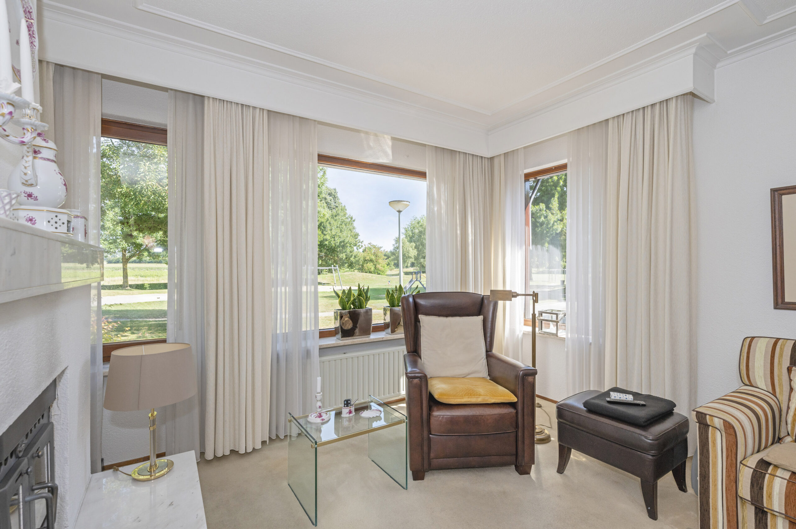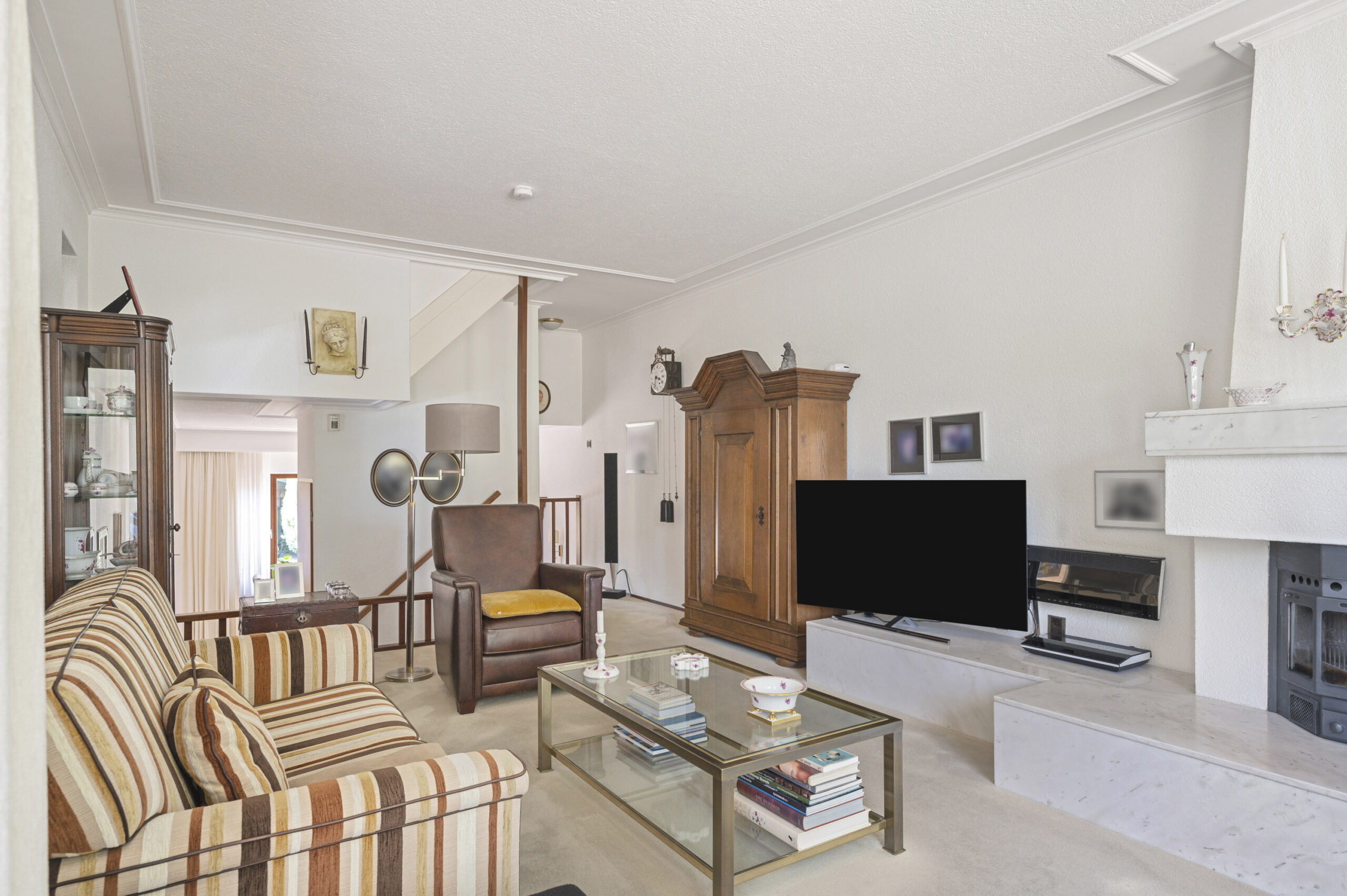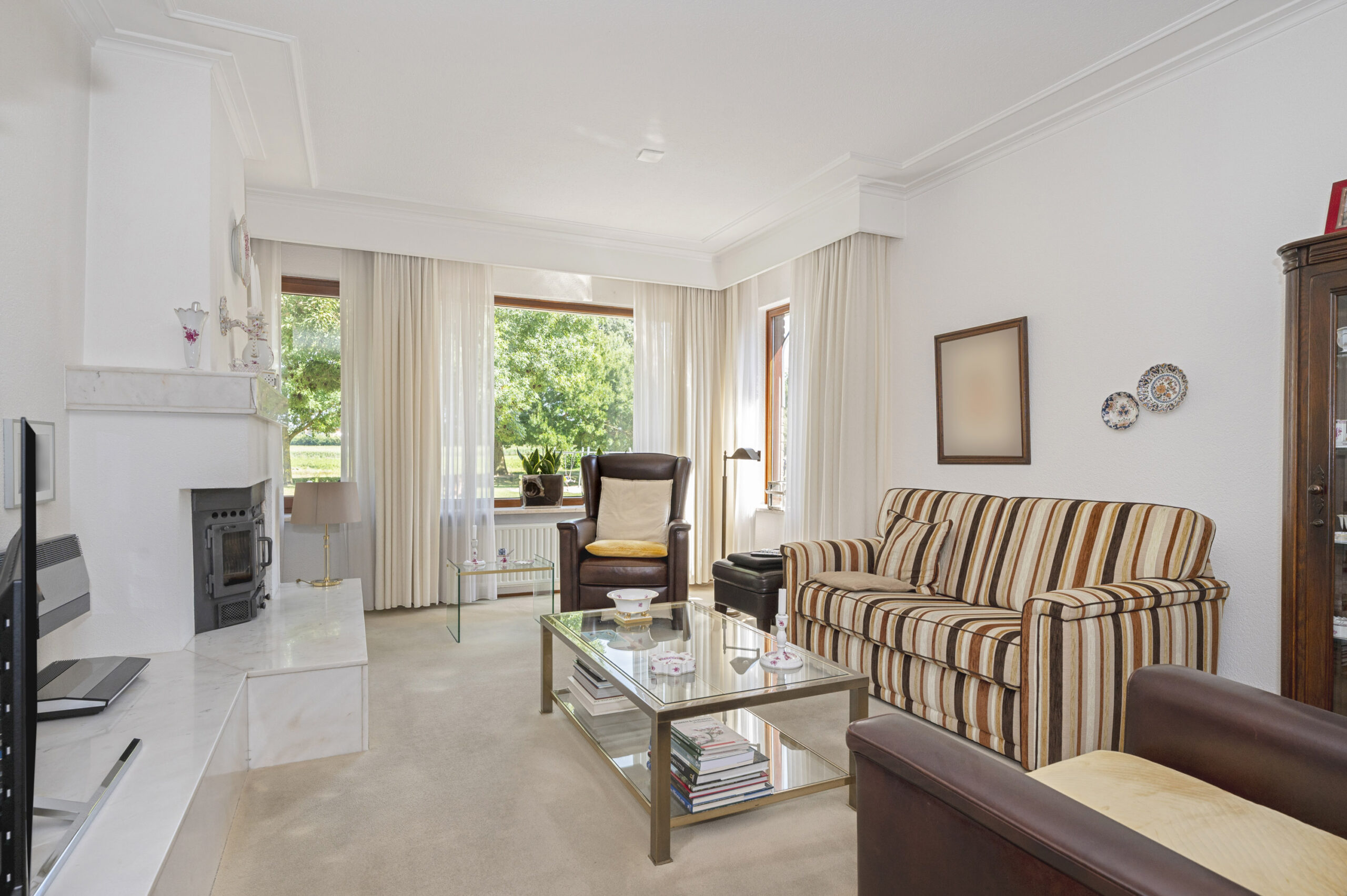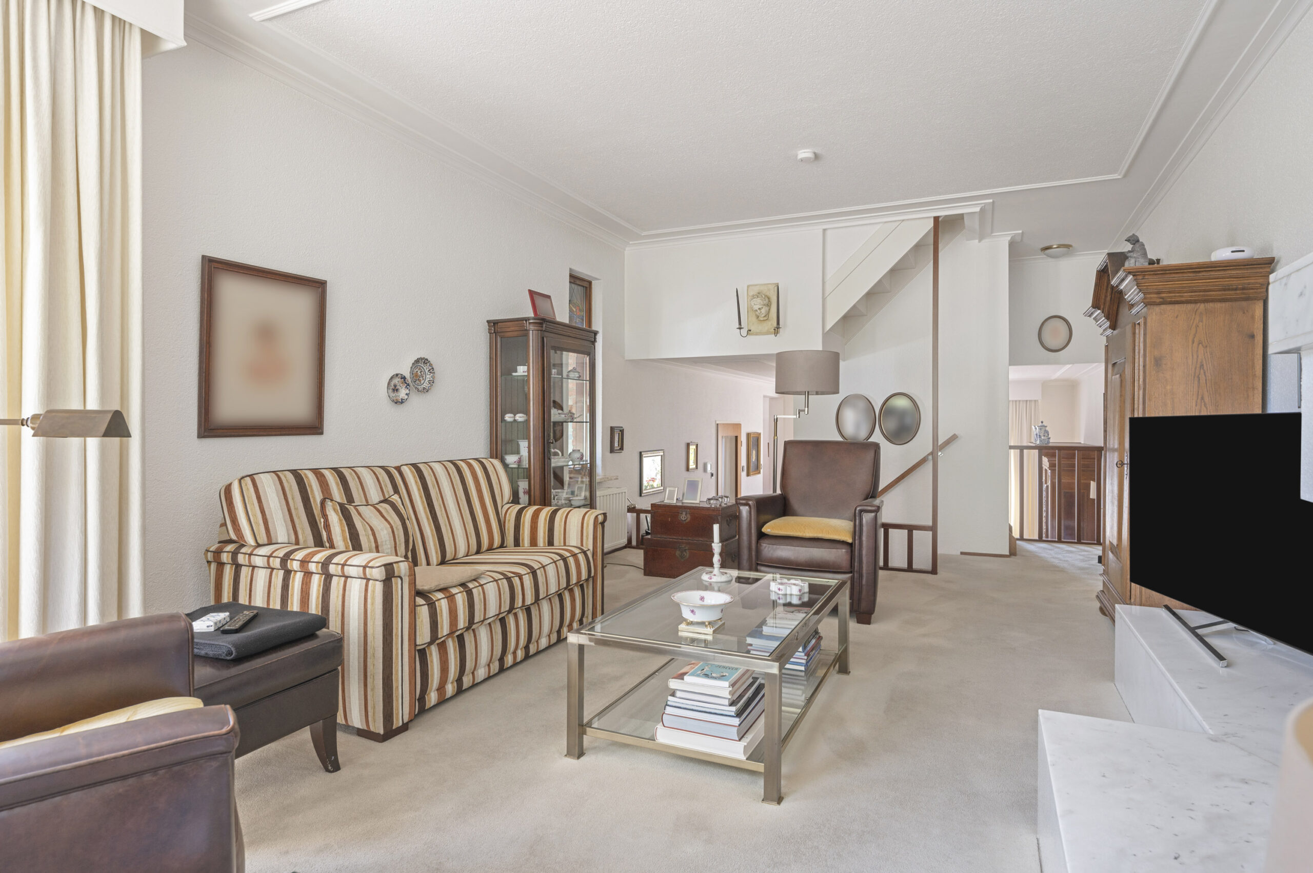 De woon-/eetkamer heeft een speelse splitlevel indeling, met de woonkamer aan de voorzijde en de eetkamer aan de achterzijde. Blikvanger in de woonkamer is de inbouwhaard, met een schouw en een marmeren plateau die tevens als tv-meubel fungeert. Het uitzicht, naar het vele groen en de speeltuin, maakt de woonkamer tot een geliefde ruimte in huis.