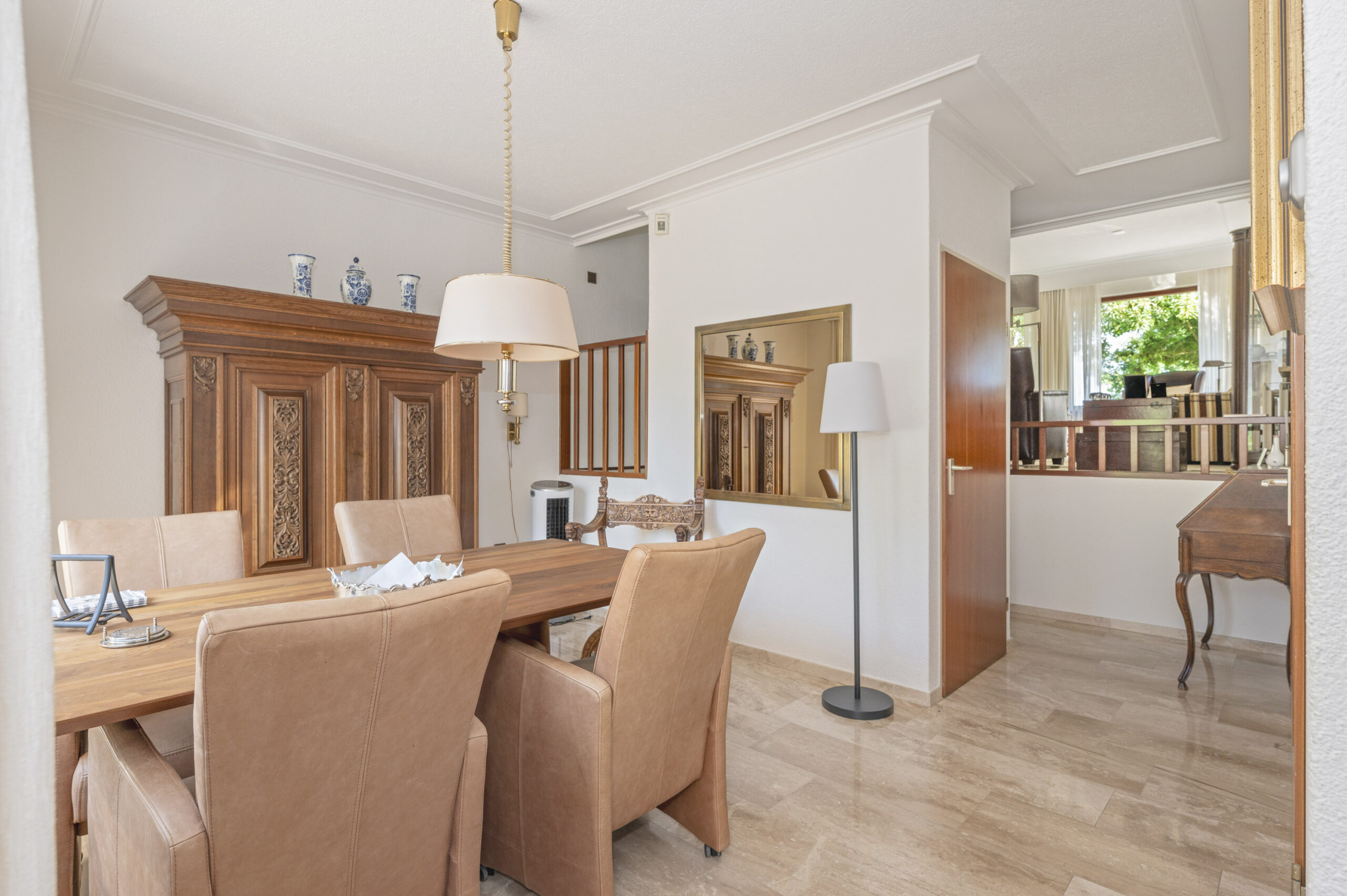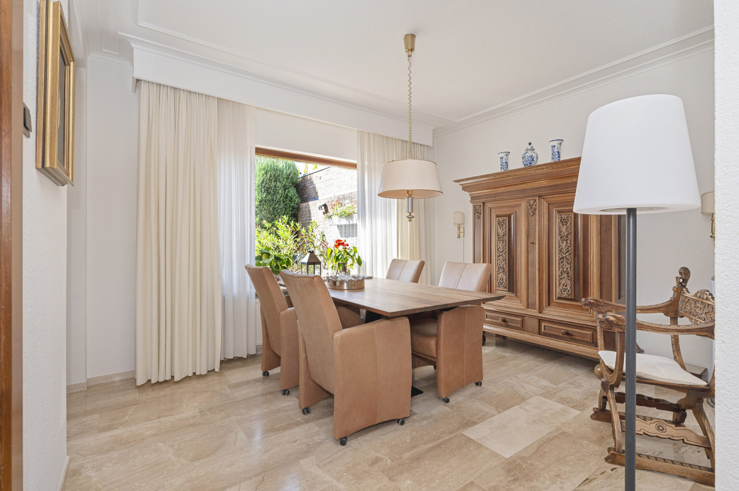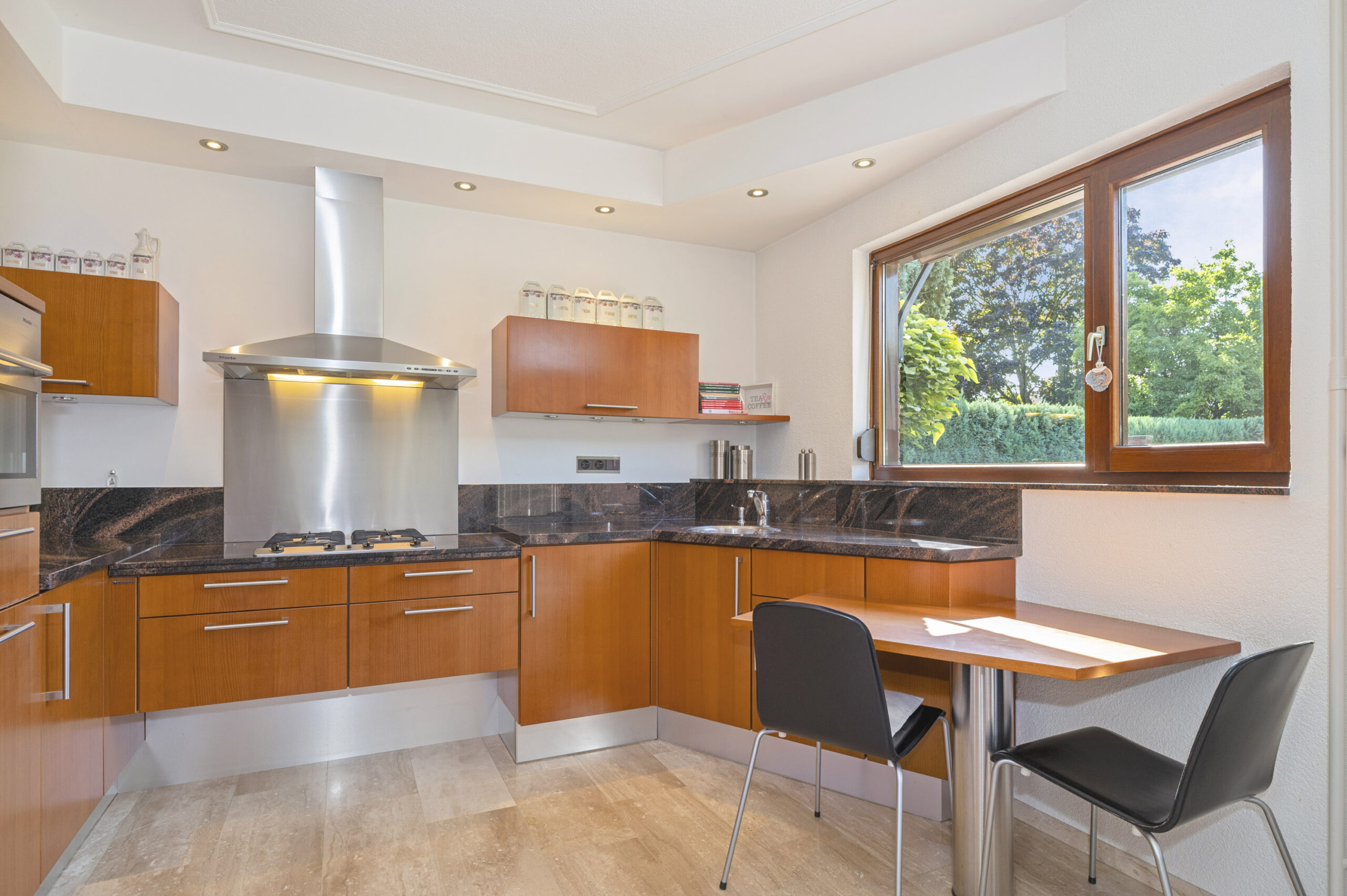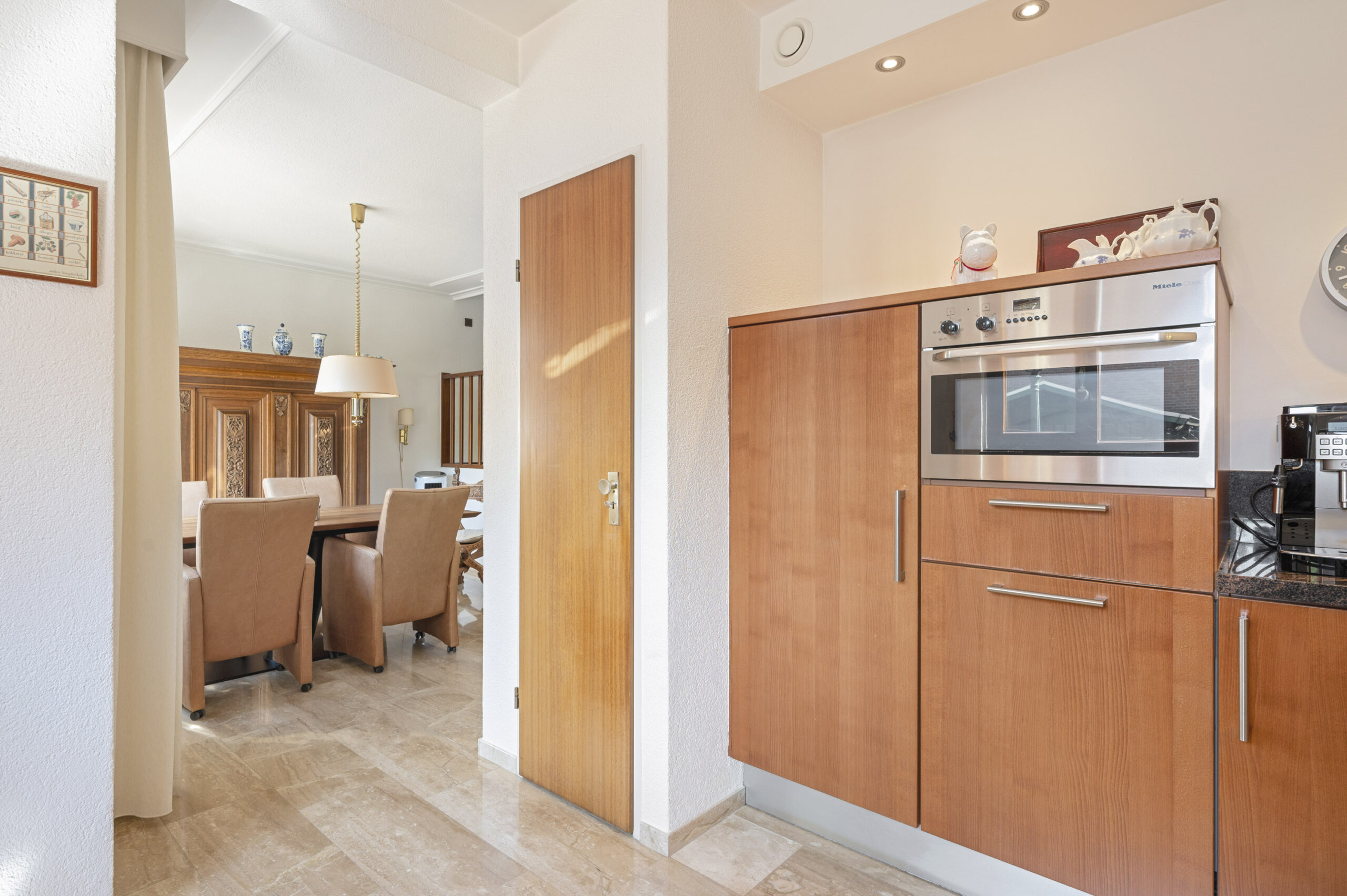 In de eetkamer, die aan de keuken grenst, is plek voor een grote tafel. Door het grote raam aan de westkant kijk je naar de royale achtertuin, en valt vanaf de middag tot zonsondergang de zon naar binnen. Er ligt, net als in de keuken, een stijlvolle travertinvloer die bij verschillende interieurstijlen past. De hoogwaardige keuken, met een marmeren aanrechtblad en een vaste ontbijttafel, is voorzien van diverse inbouwapparatuur: een gaskookplaat, afzuigkap, vaatwasser, combi-oven en een koelkast. De vaatwasser en koelkast, van Miele en Liebherr, zijn in de afgelopen jaren vernieuwd.