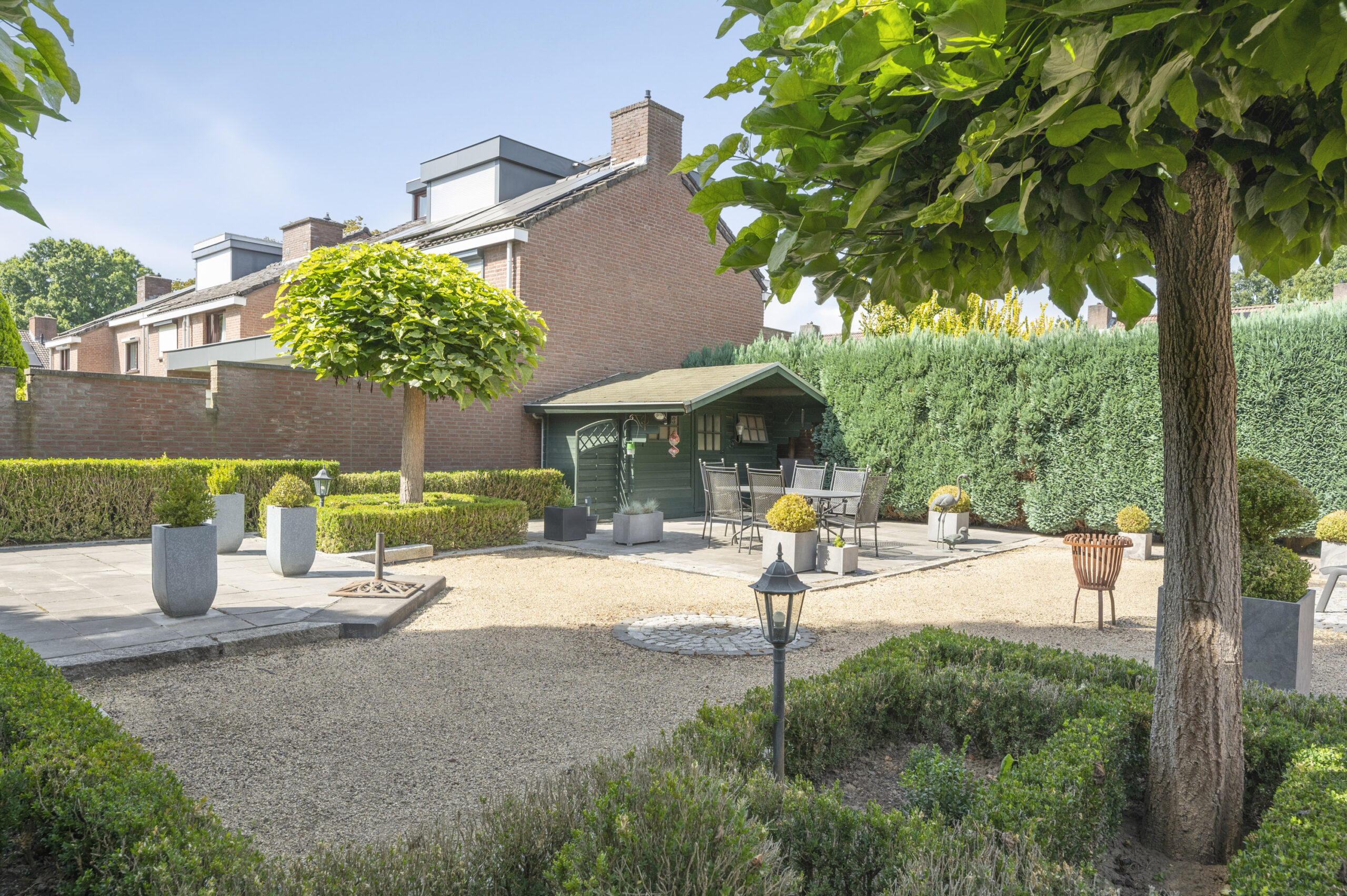 Mooi vormgegeven buxushagen, sierbestrating en een vlaggenmast bepalen de sfeer in de voortuin. Er is parkeergelegenheid voor meerdere auto’s, en naast de garage is een eigen achterom met een fraaie poort.
