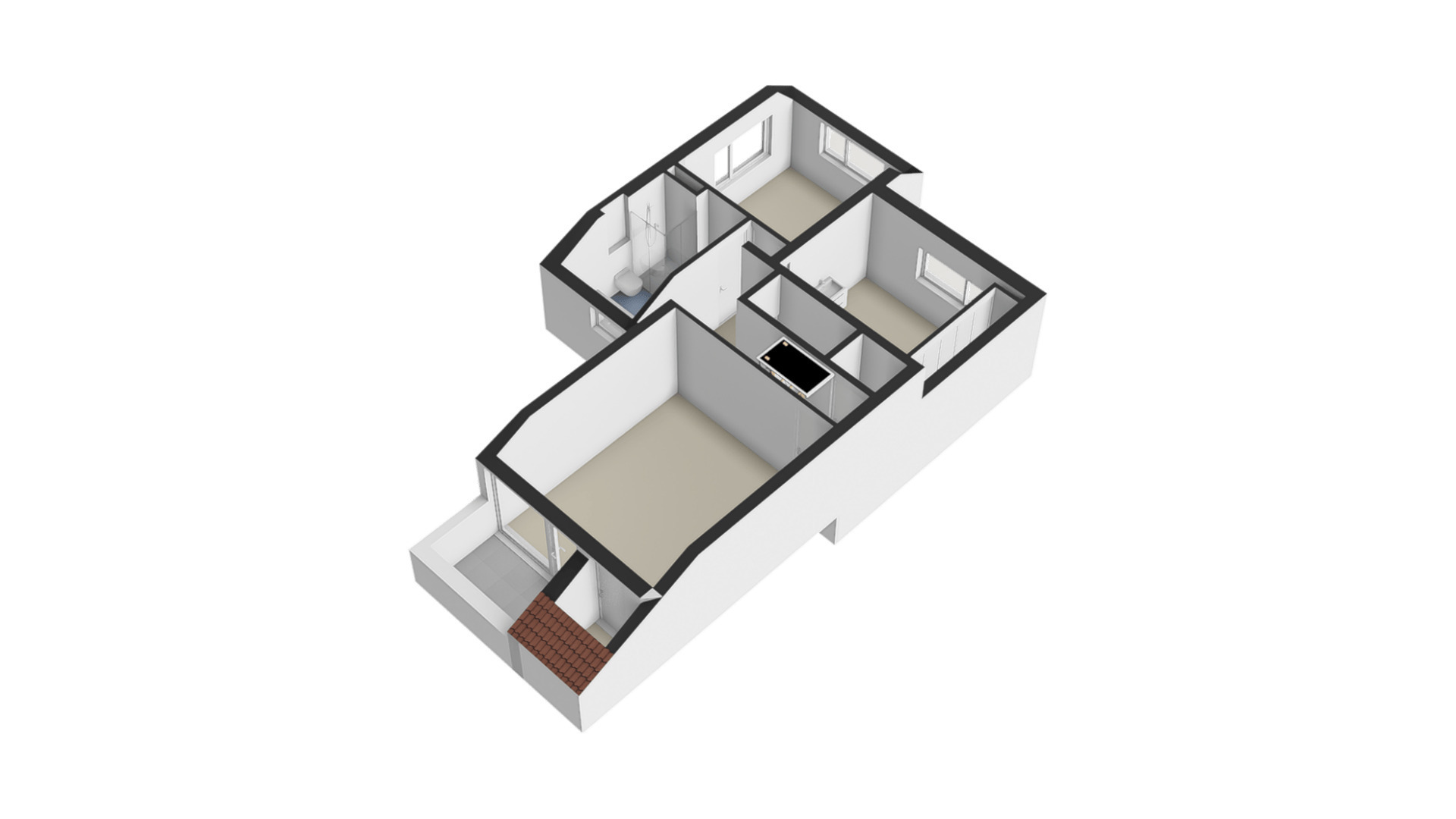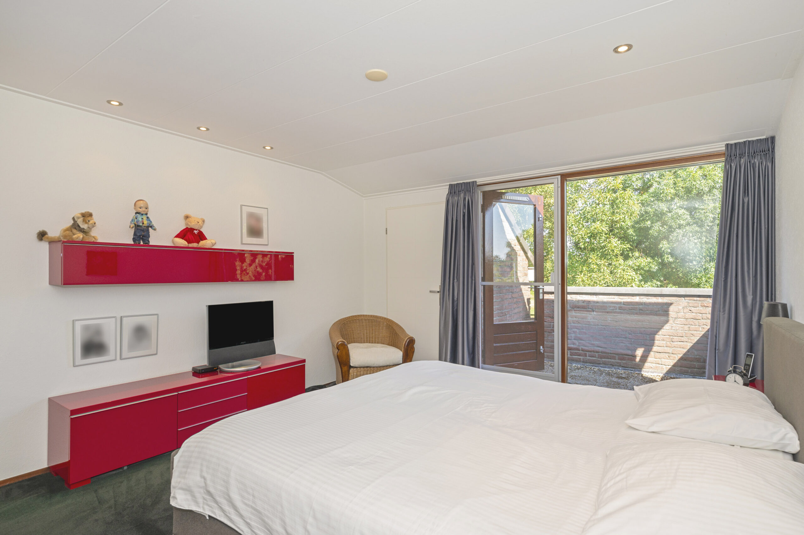 Niet alleen de begane grond, maar ook de eerste verdieping heeft een speelse indeling. Aan de achterzijde zijn twee slaapkamers, waarvan een in gebruik is als kleedruimte. In deze kamer staat een grote, L-vormige maatwerk kastenwand en er hangt een wastafel met meubel. De master bedroom, met een inbouwkast en een dakterras, is aan de voorzijde. Als je vanuit deze kamer het uitzicht bewondert, ben je op slag verliefd…