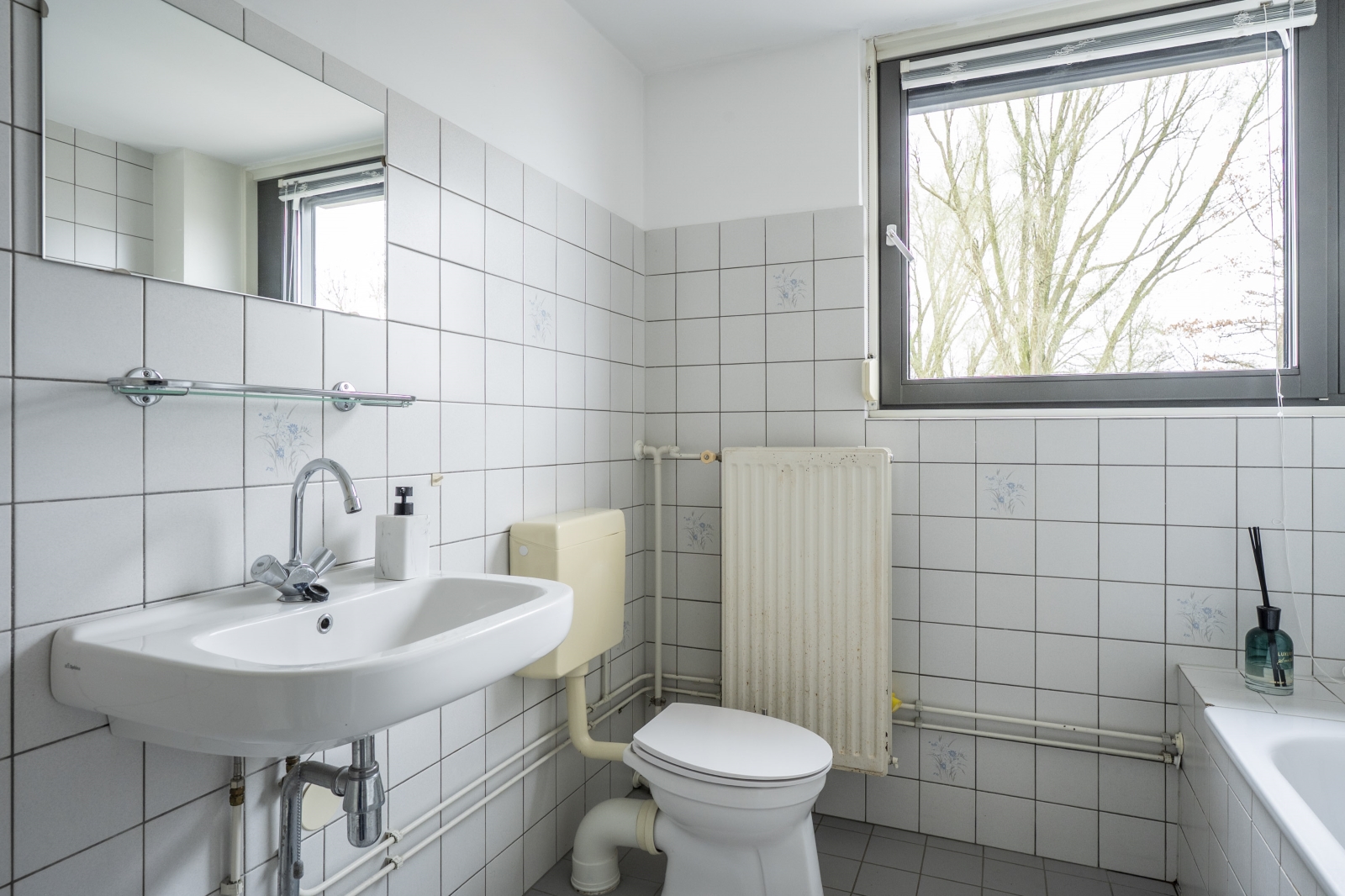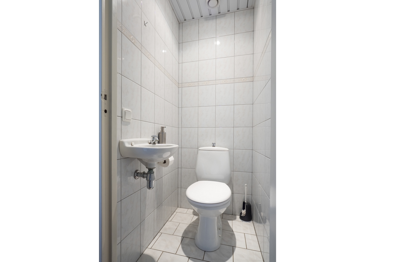 Het toilet is deels betegeld en voorzien van een staand closet en een fonteintje.