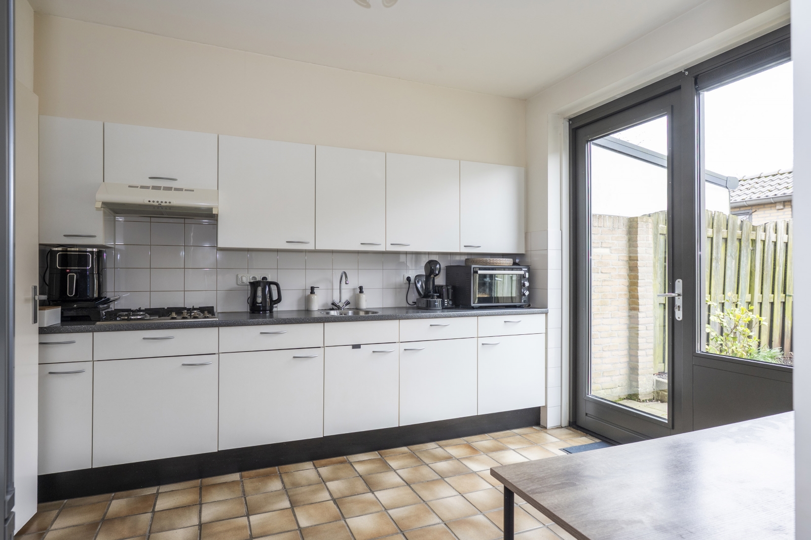 De keuken (ca. 10m²) is aan de achterzijde van de woning gelegen en is voorzien van een keukenaanbouw in rechte opstelling met boven- en onderkasten, spoelbak, 4-pits gasfornuis, afzuigkap. Het geheel is netjes afgewerkt met een werkblad van kunststof. Vanuit de keuken is er rechtstreeks toegang de achtertuin.