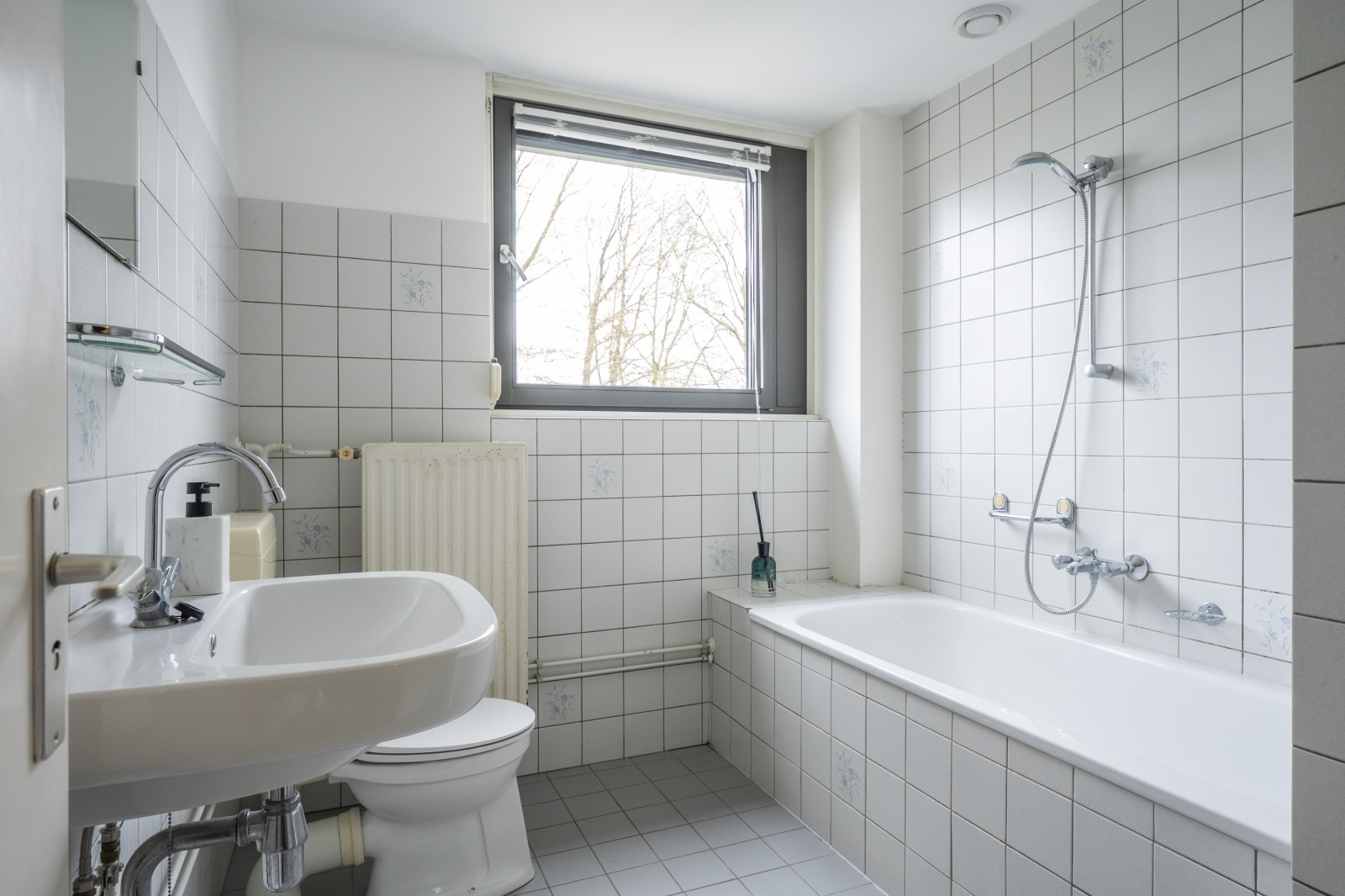 Nette, deels betegelde badkamer (ca. 5m²), voorzien van een ligbad, wastafel en staand closet. Bergruimte (ca. 2m²) met de aansluitpunten voor een douche. Optioneel zou in deze ruimte een vaste trap naar de zolder gerealiseerd kunnen worden.
