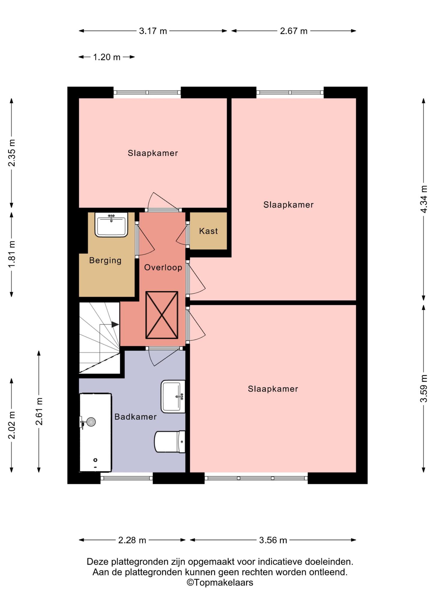 Overloop met toegang tot 3 slaapkamers, de badkamer en een bergruimte.