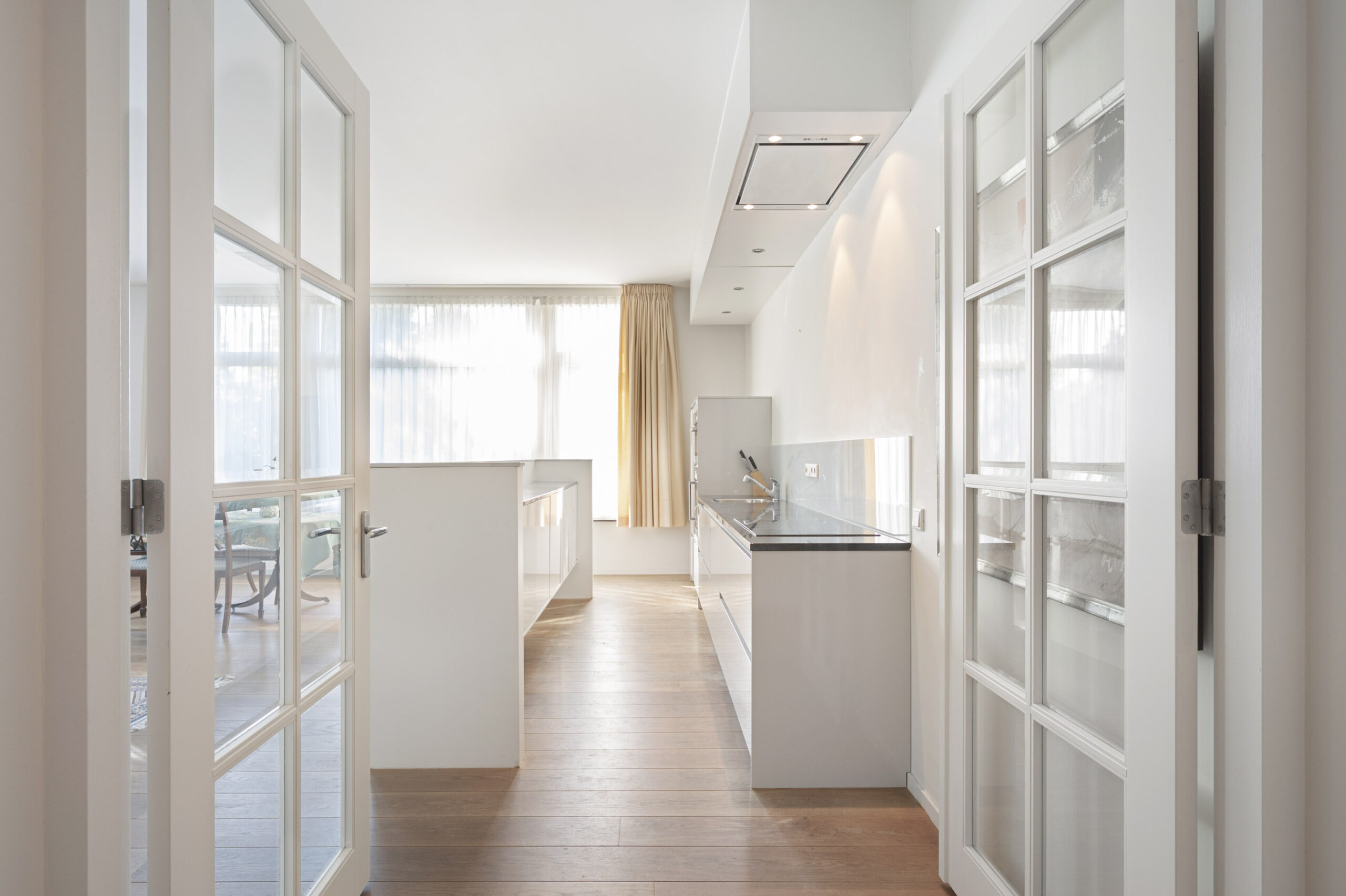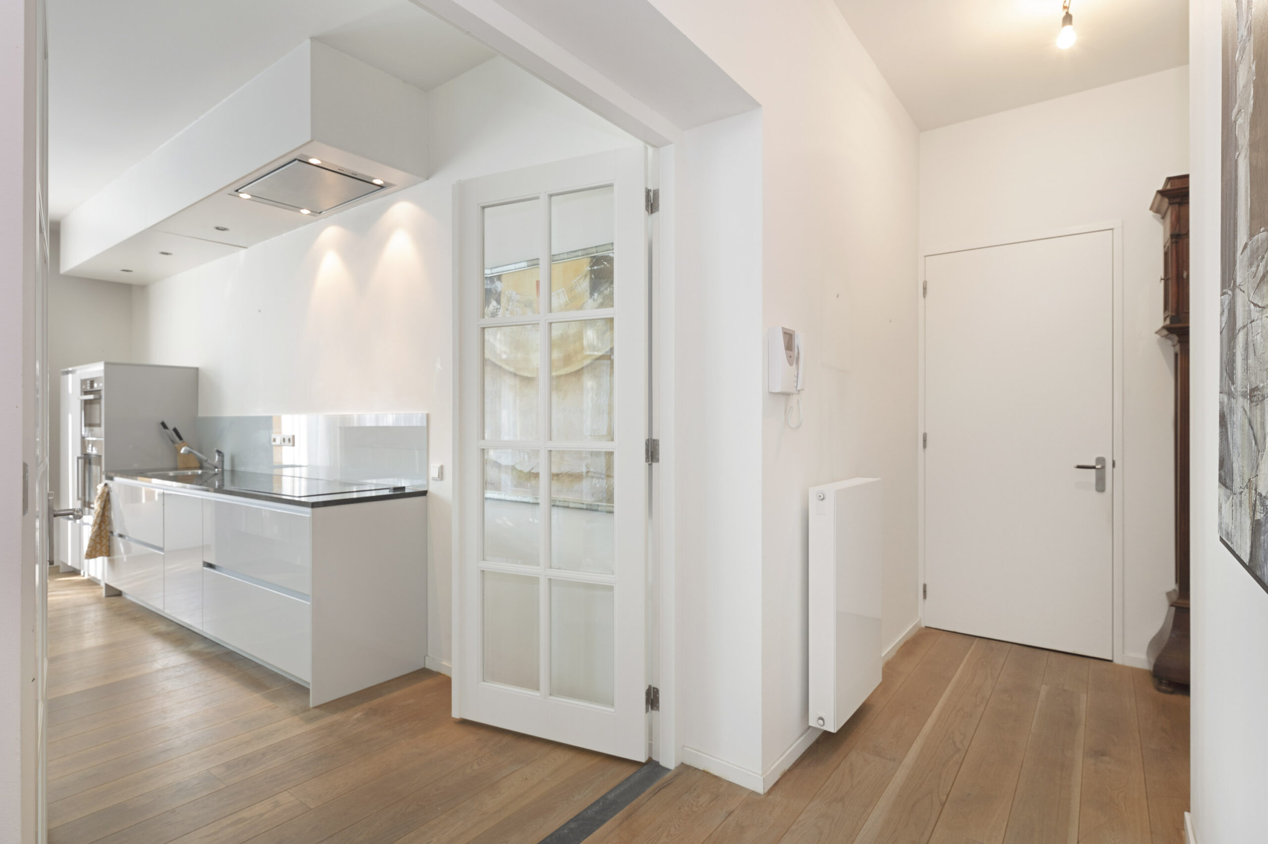 Twee deuren met glas verbinden de hal met de keuken en woonkamer, die samen een aangename leefruimte vormen.