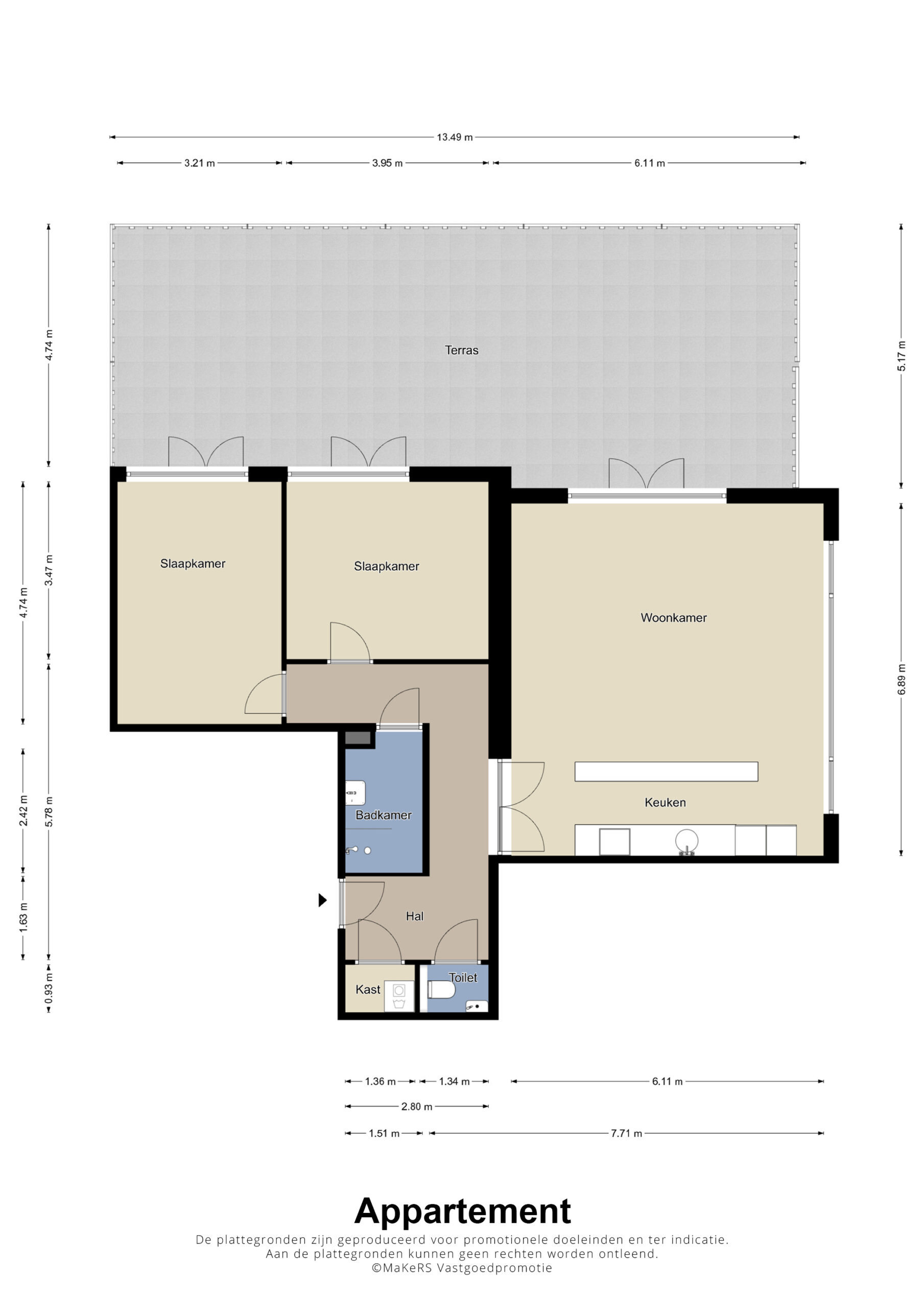 – Circa 66 m2 groot dakterras, te bereiken vanuit de woonkamer en beide slaapkamers;